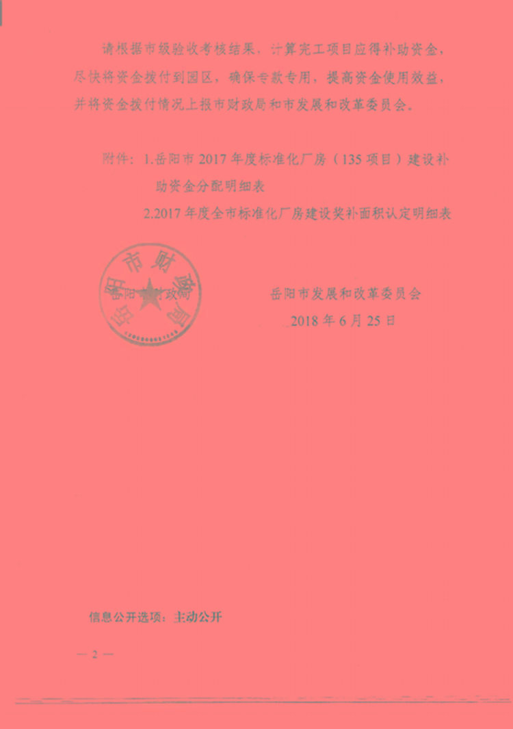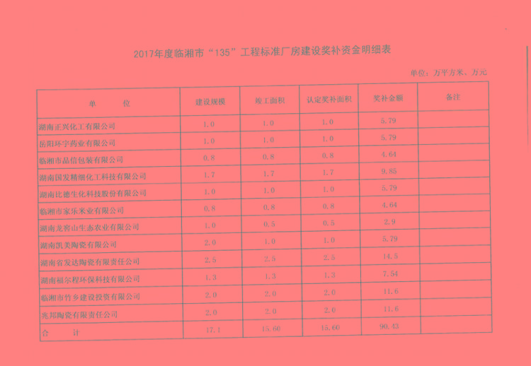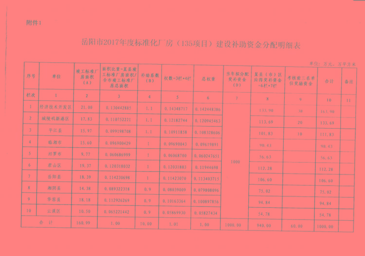 岳阳市2017年度标准化厂房(135项目)建设补助资金分配明细表
