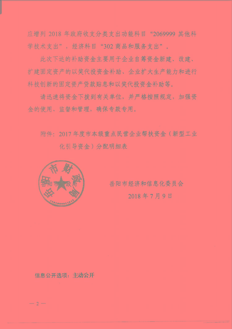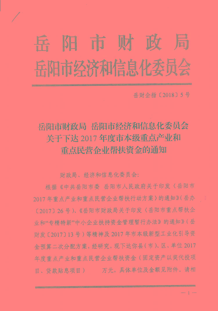岳阳市财政局岳阳市经济和信息化委员会关于下达2017年度市本级重点产业和重点民营企业帮扶资金的通知