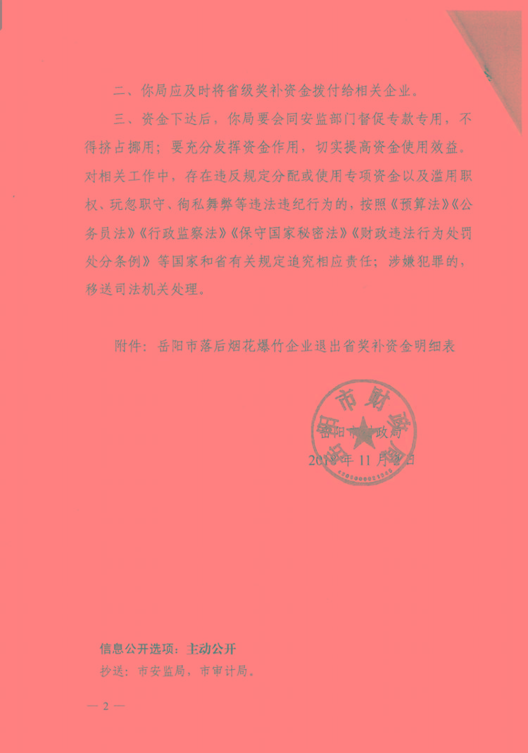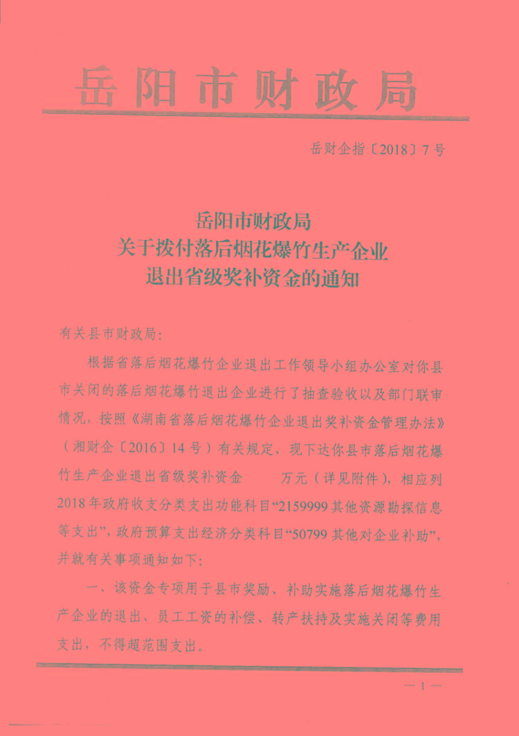 岳阳市财政局关于拨付落后烟花爆竹生产企业退出省级奖补资金的通知