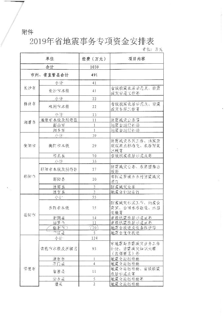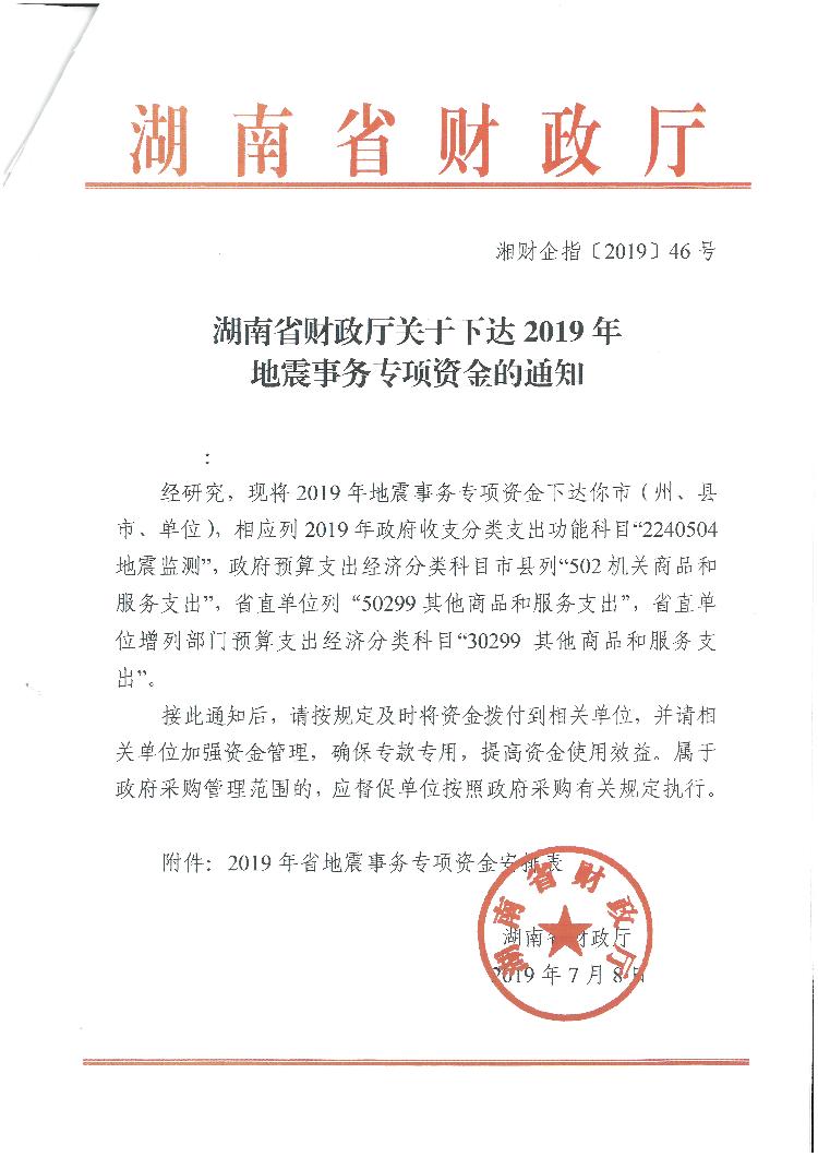湖南省财政厅关于下达2019年地震是无专项资金的通知