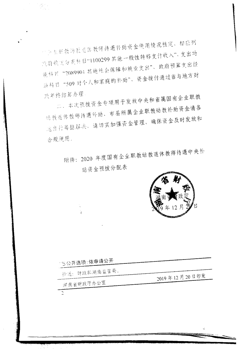 临财预指【2019】13号 关于预拨2020年国有企业职教幼教退休教师待遇中央补助资金的通知