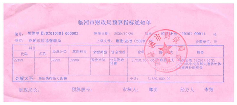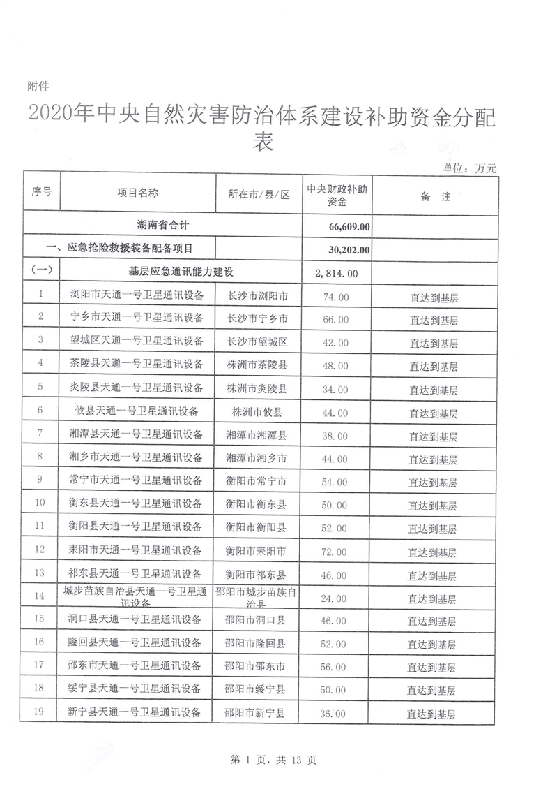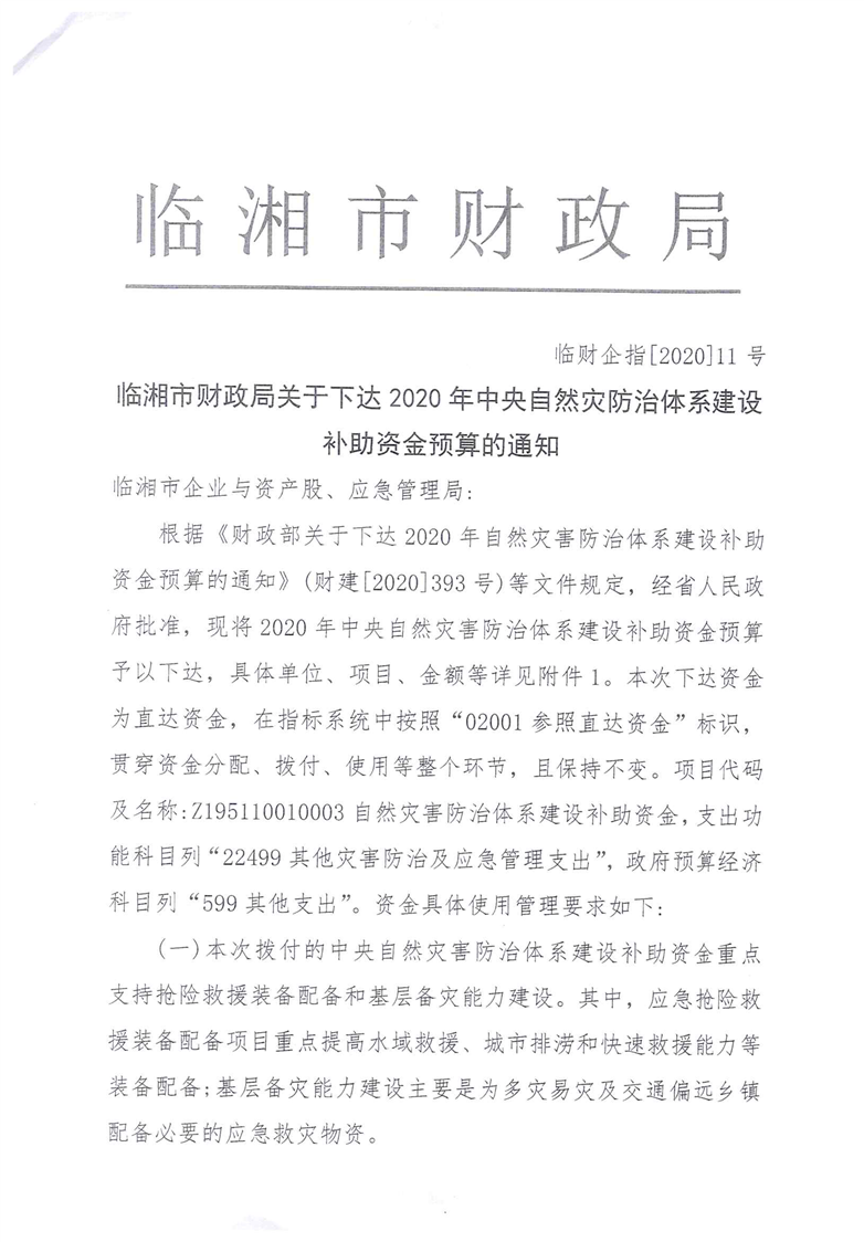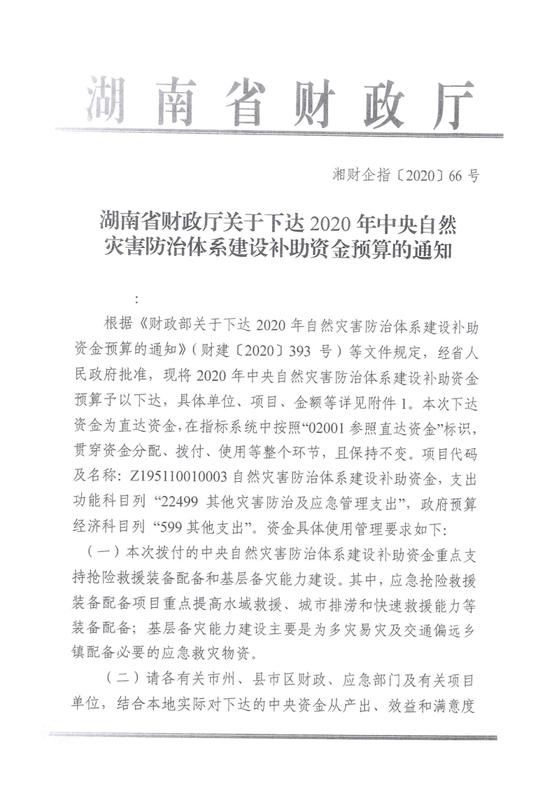 湖南省财政厅关于下达2020年中央自然灾害防治体系建设补助资金预算的通知