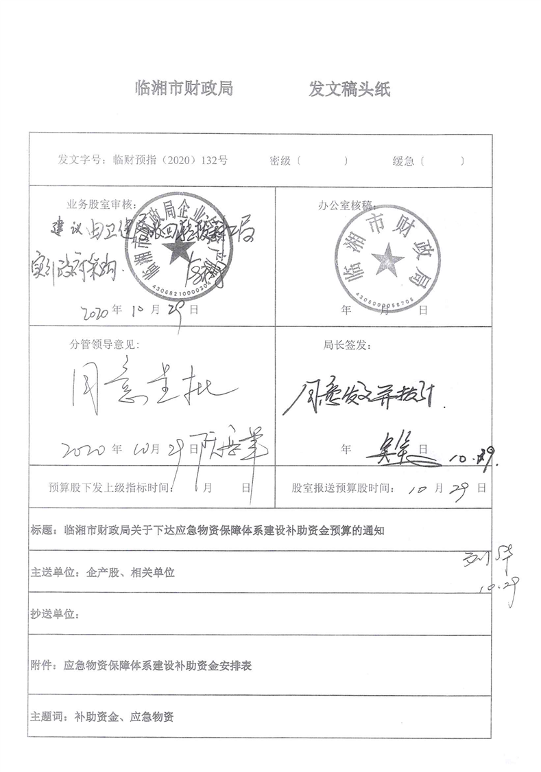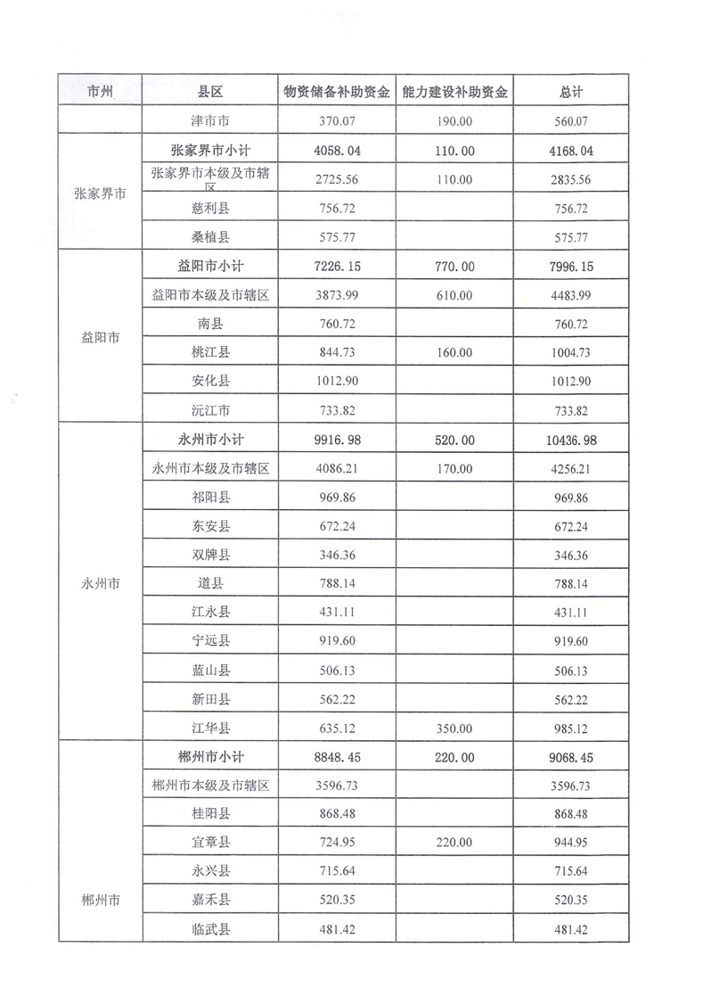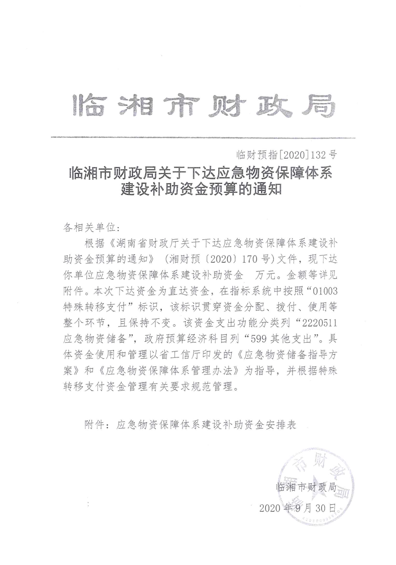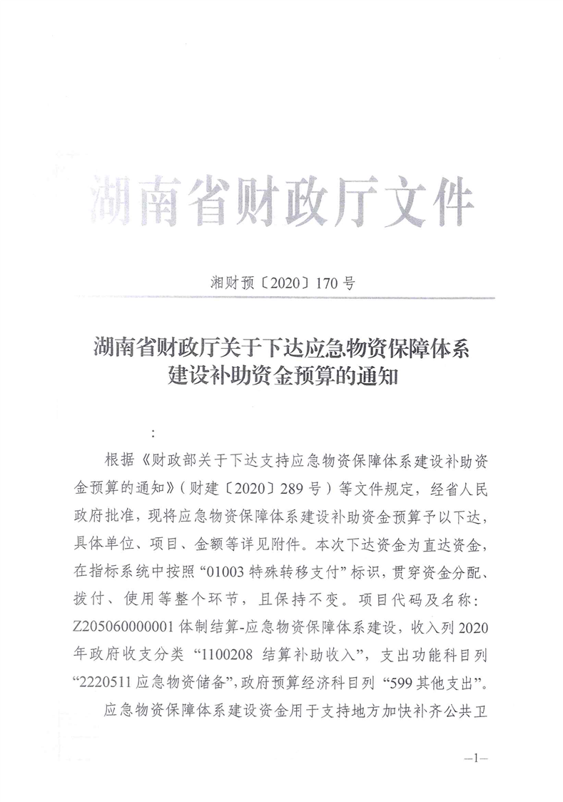 湖南省财政厅关于下达应急物资保障体系建设补助资金预算的通知