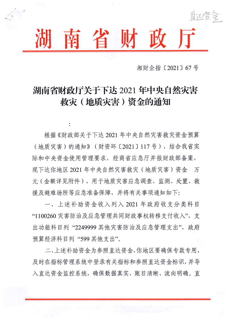 关于下达2021年中央自然灾害救灾(地质灾害)资金的通知