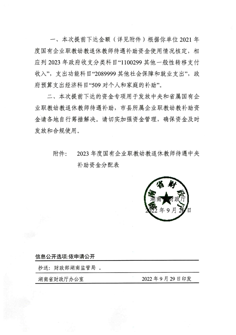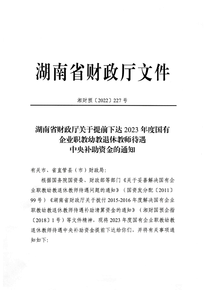 关于提前下达2023年度国有企业职教幼教退休教师待遇中央补助资金的通知