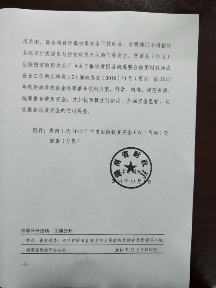 湖南省财政厅关于提前下达2017年中央财政扶贫资金(以工代赈)的通知