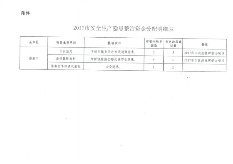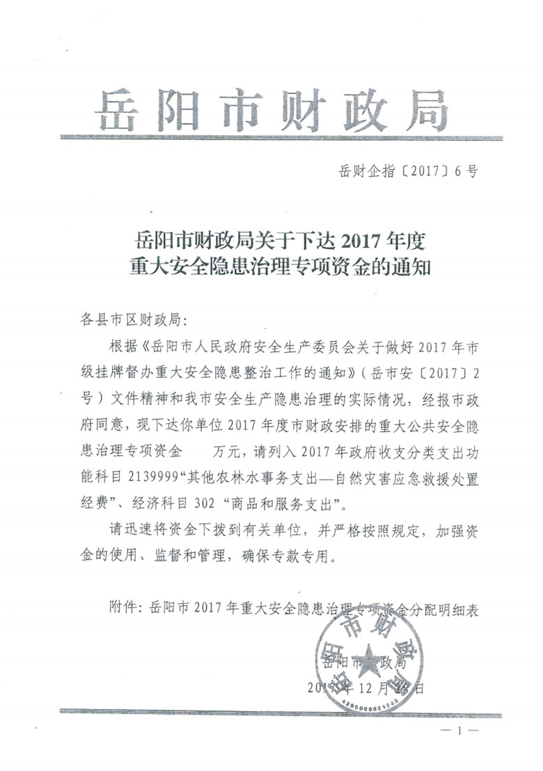 岳阳市财政局关于下达2017年度重大安全隐患治理专项资金的通知