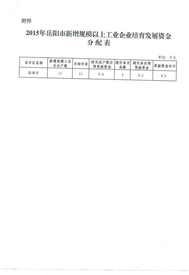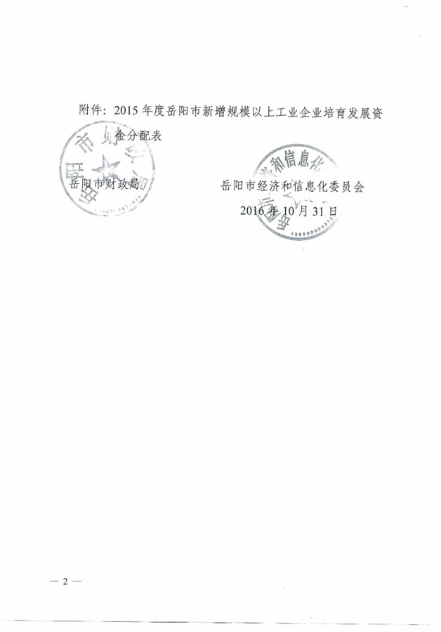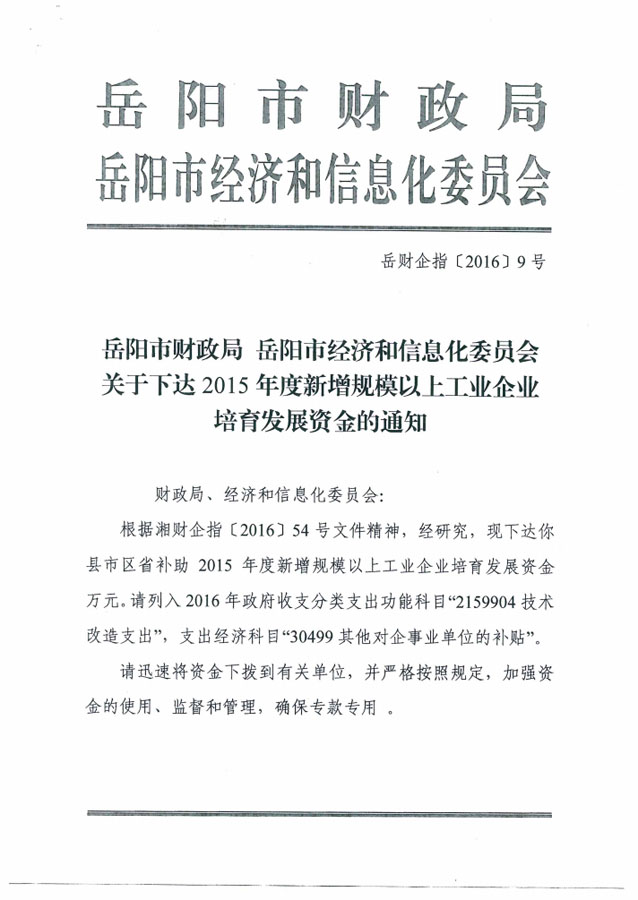 岳阳市财政局 岳阳市经济和信息化委员会关于下达2015年度新增规模以上工业企业培育发展资金的通知