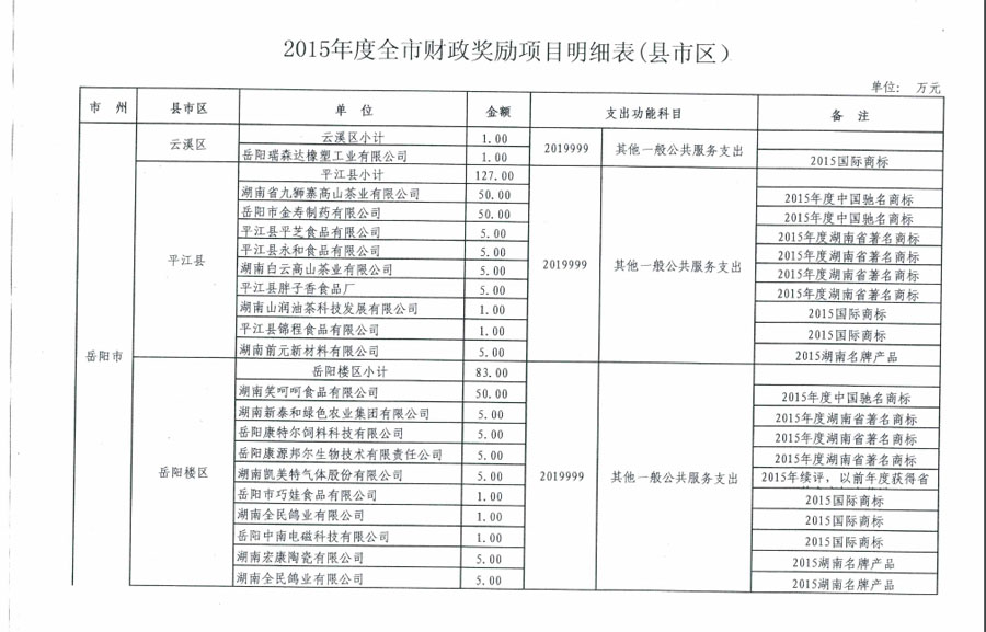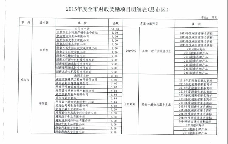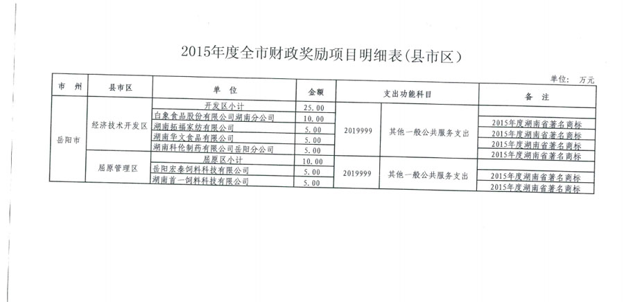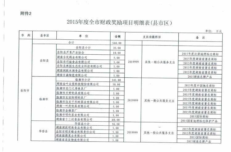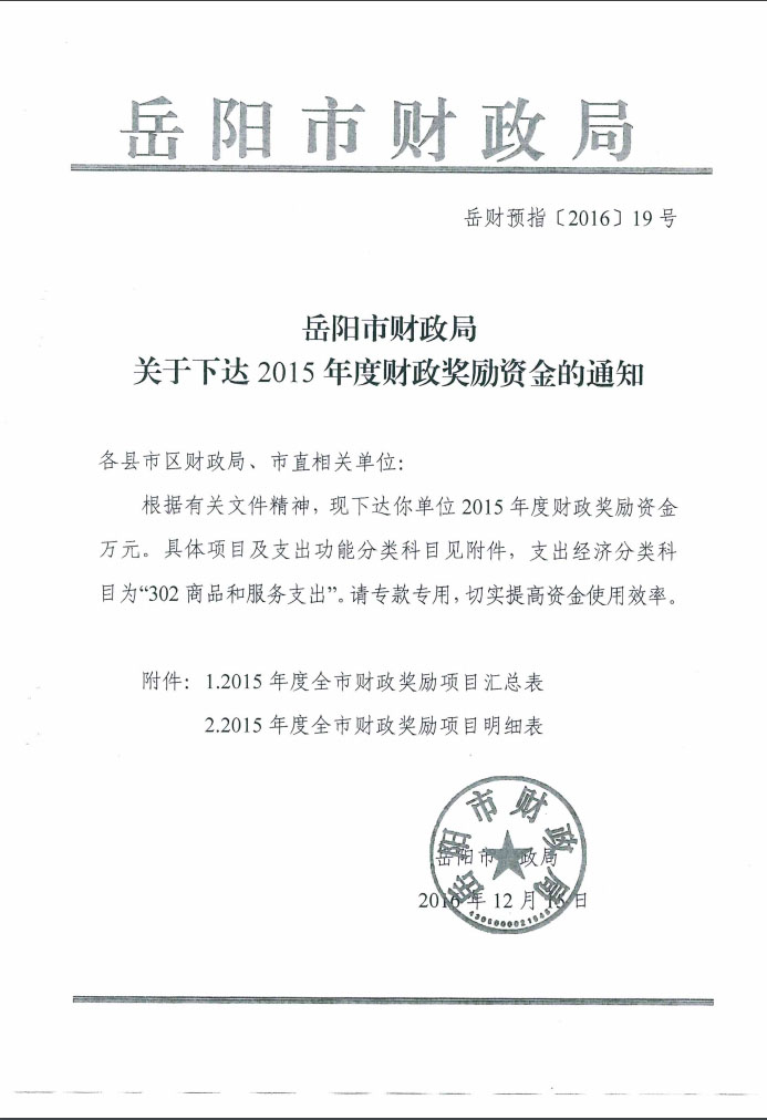 岳阳市财政局关于下达2015年度财政奖励资金的通知
