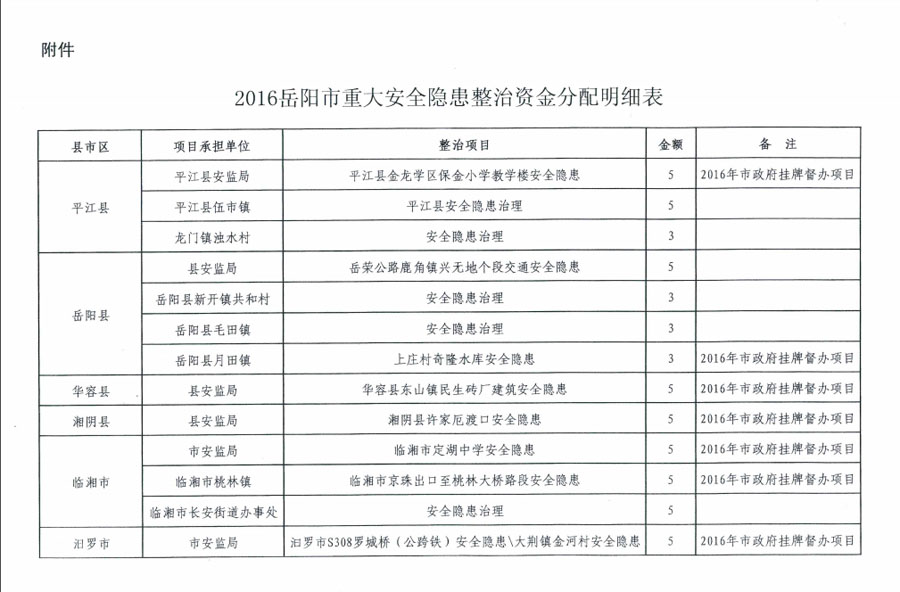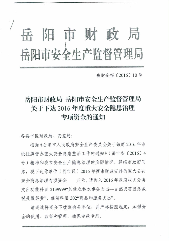岳阳市财政局 岳阳市安全生产监督管理局关于下达2016年度重大安全隐患治理专项资金的通知