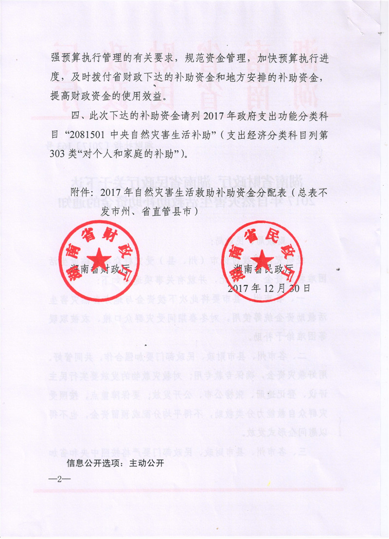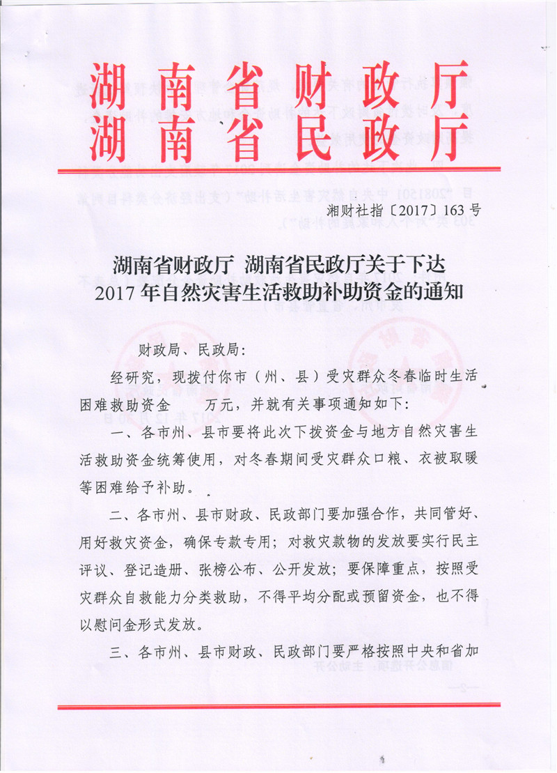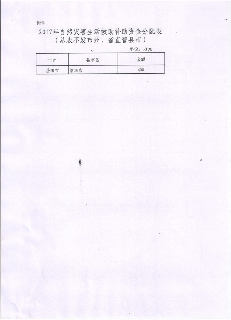 湖南省财政厅湖南省民政厅关于下达2017年自然灾害生活救助补助资金的通知
