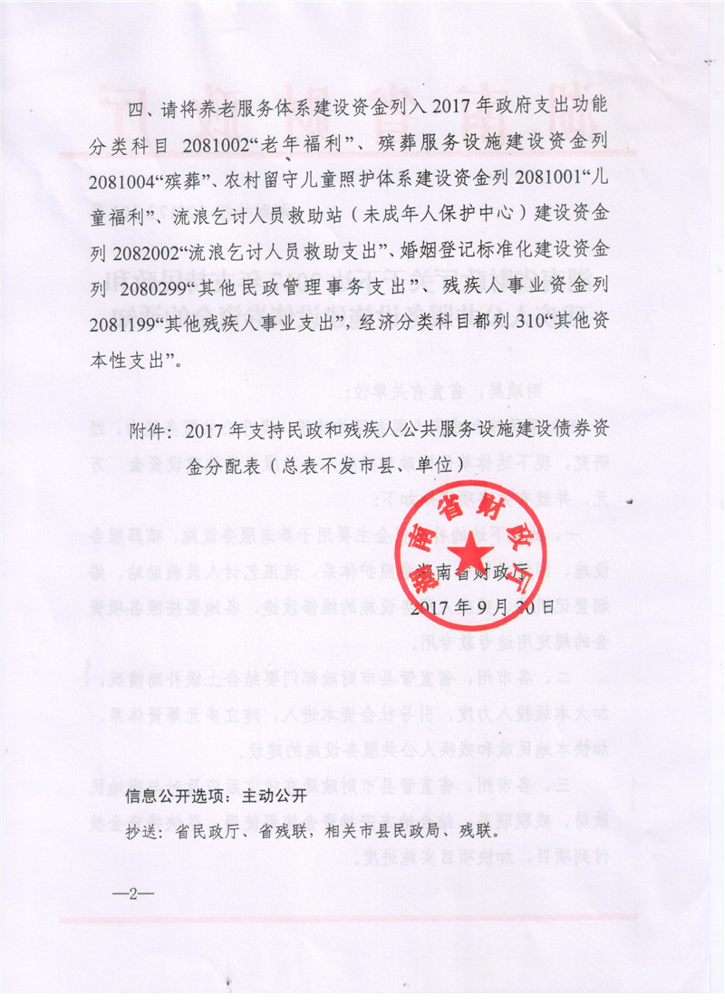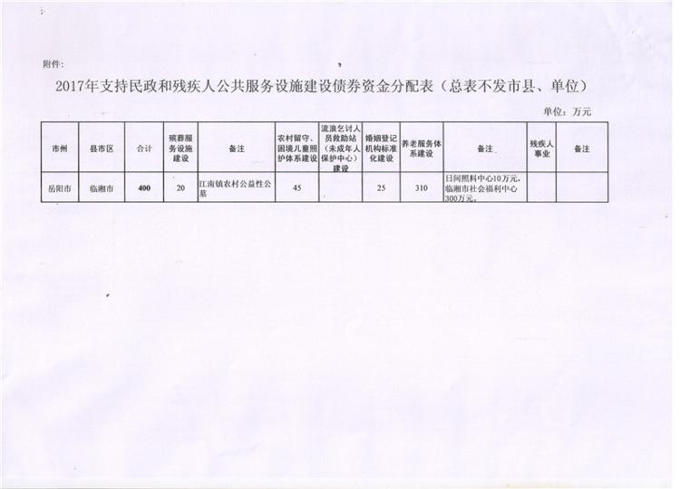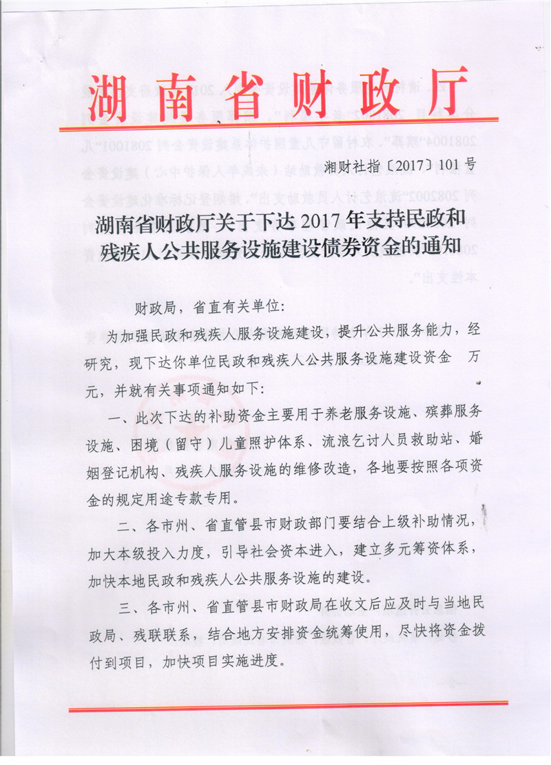 湖南省财政厅关于下达2017年支持民政和残疾人公共服务设施建设债券资金的通知