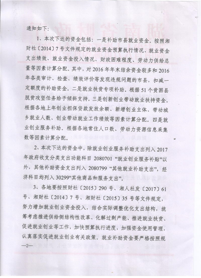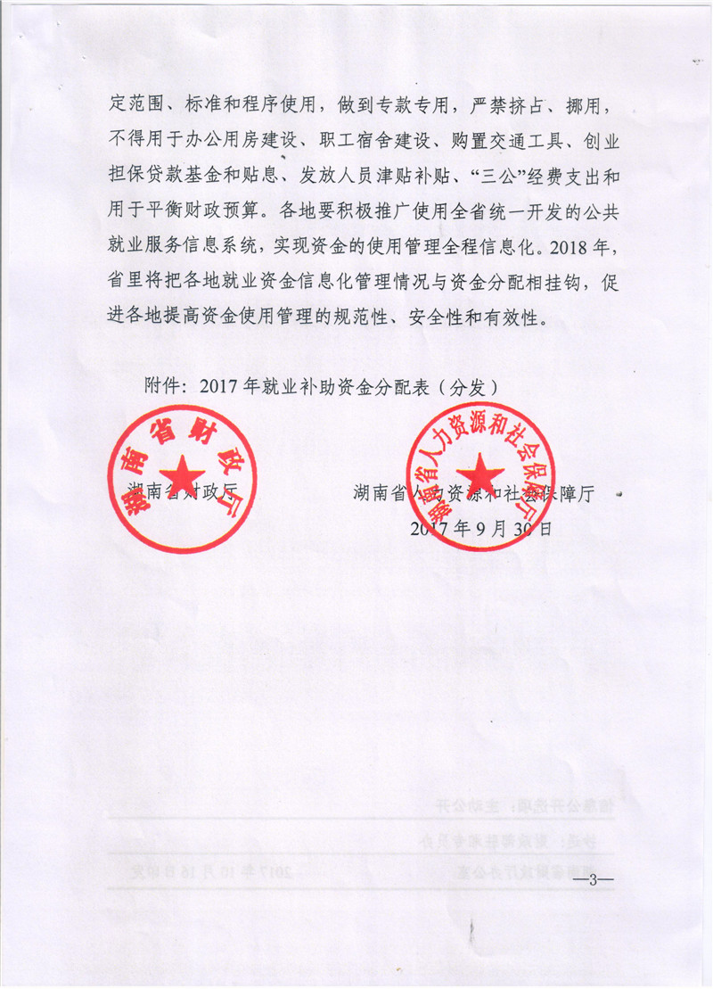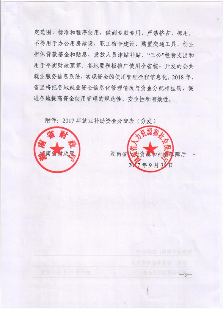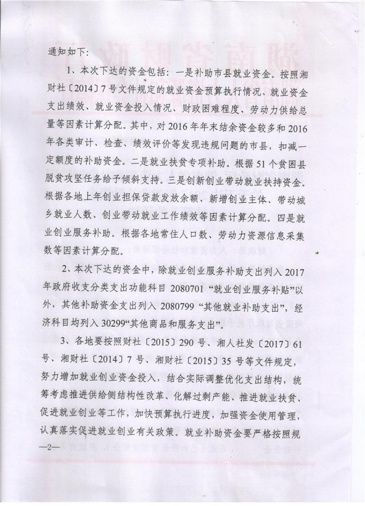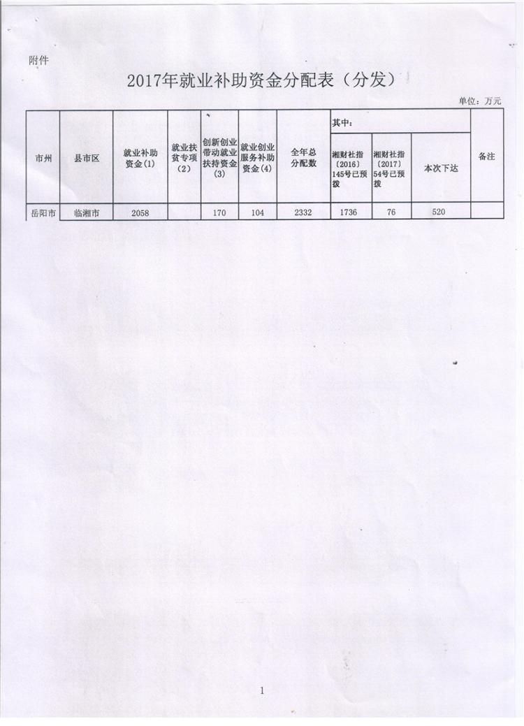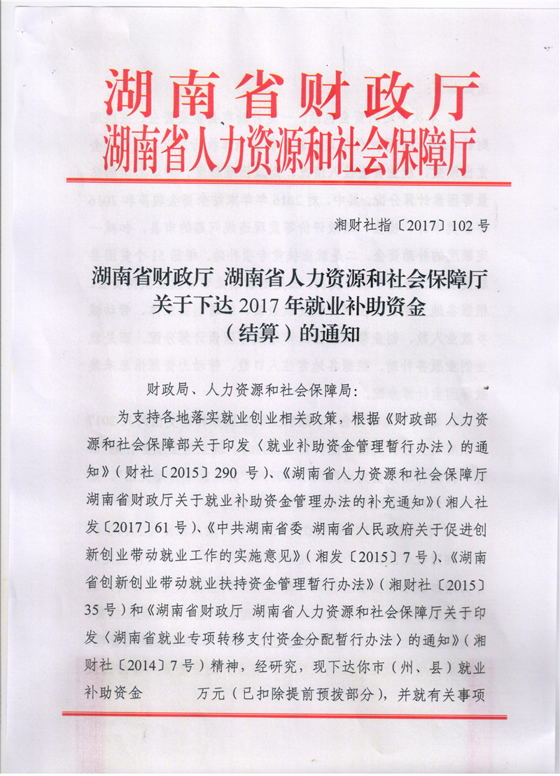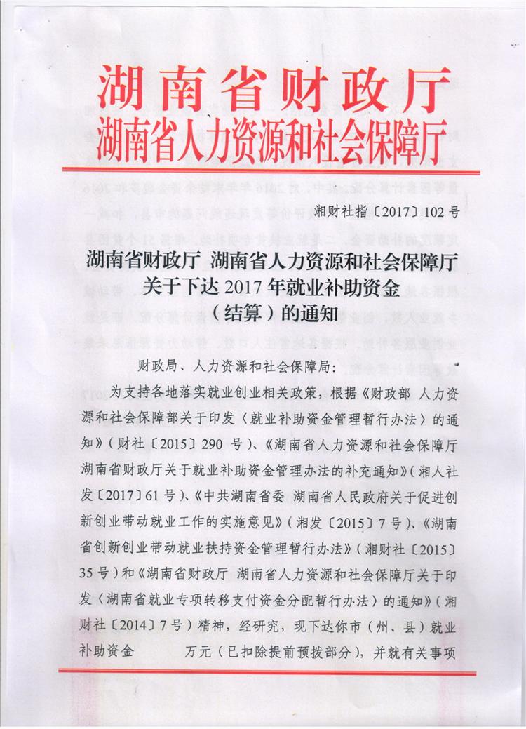 湖南省财政厅湖南省人力资源和社会保障厅关于下达2017年就业补助资金(结算)的通知