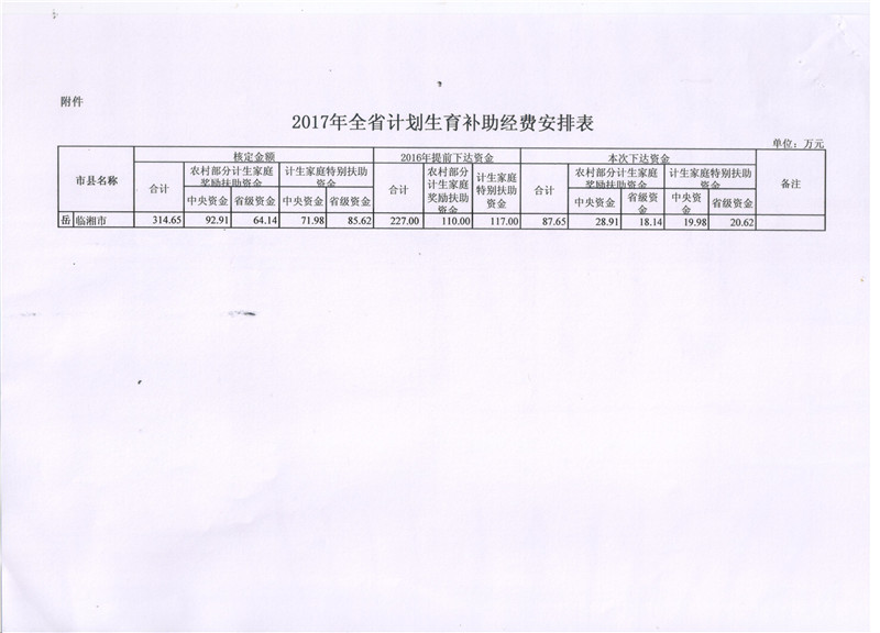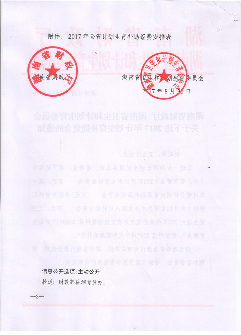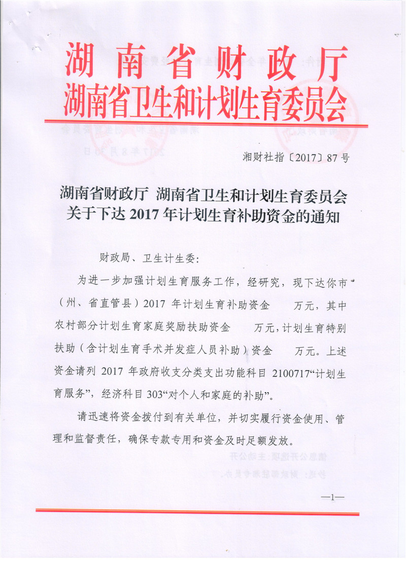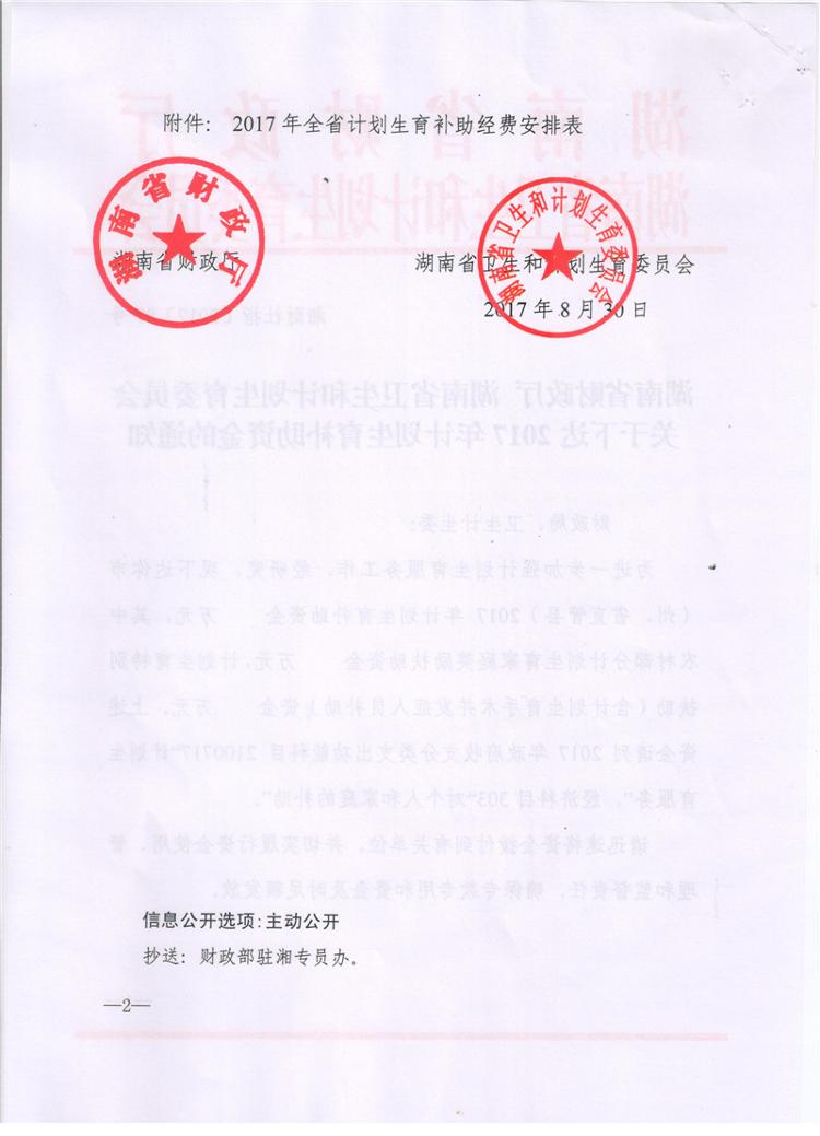 湖南省财政厅湖南省卫生和计划生育委员会关于下达2017年计划生育补助资金的通知