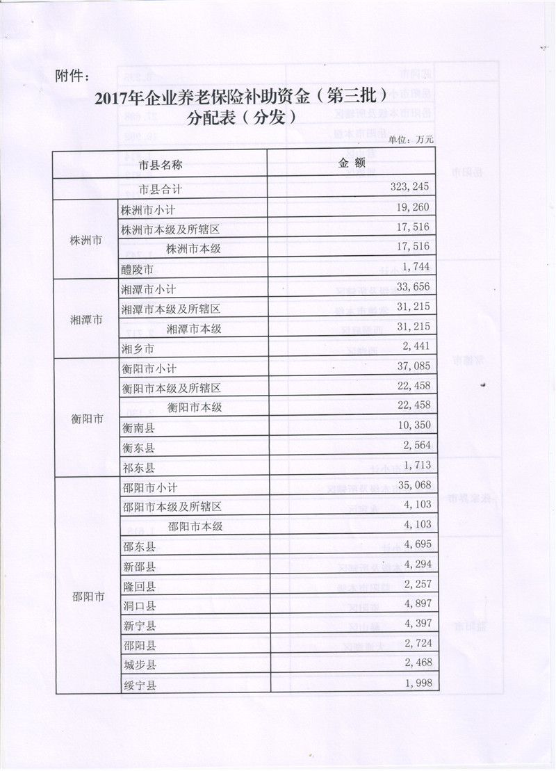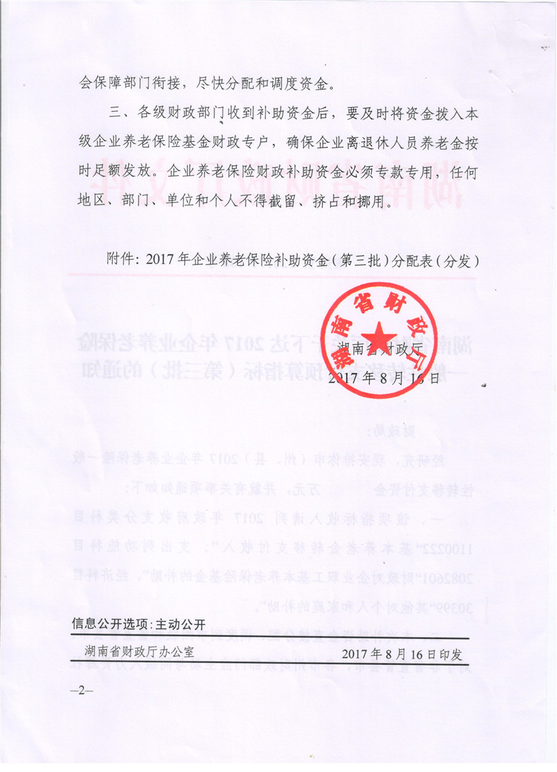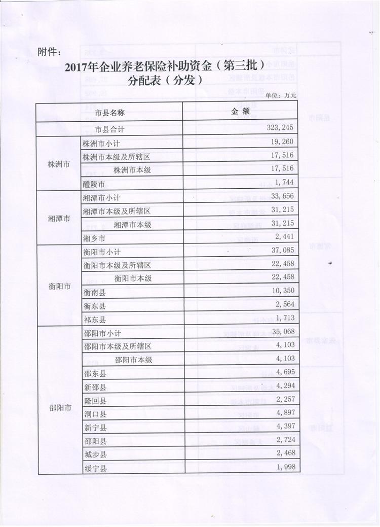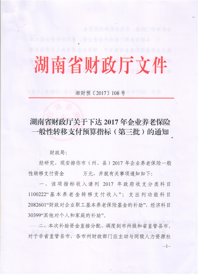 湖南省财政厅关于下达2017年企业养老保险一般性转移支付预算指标(第三批)的通知
