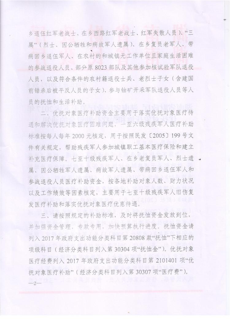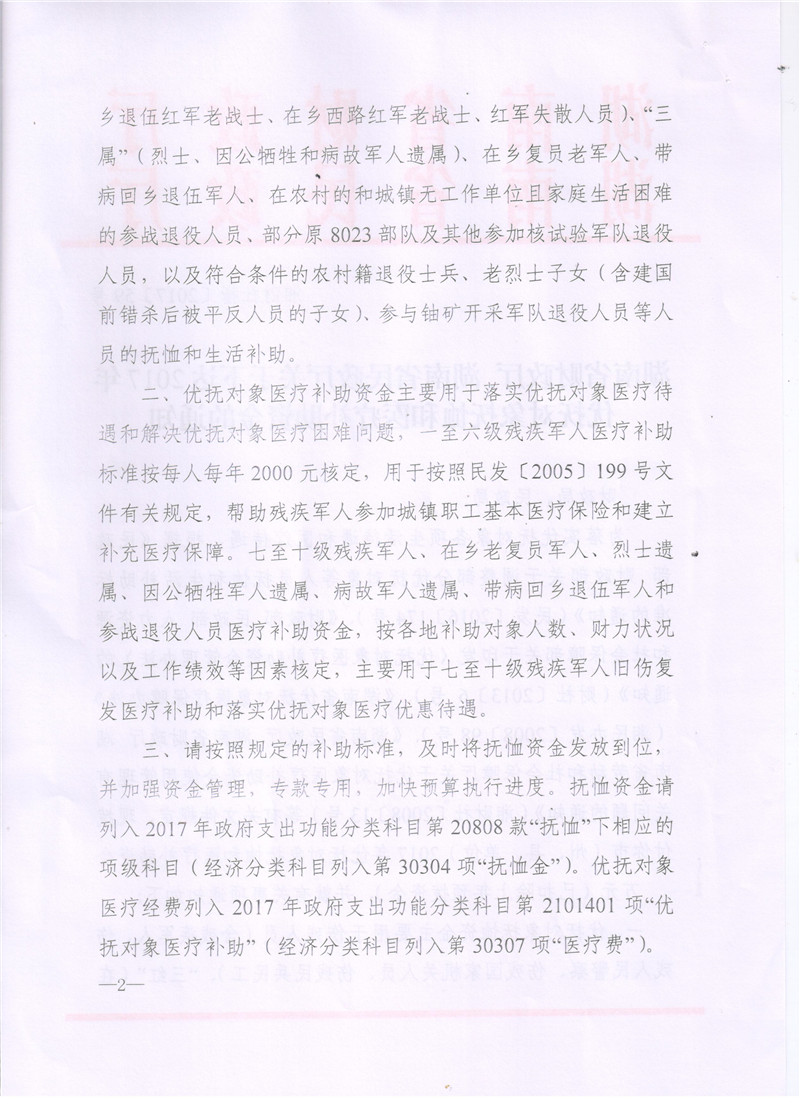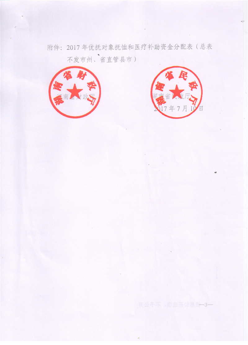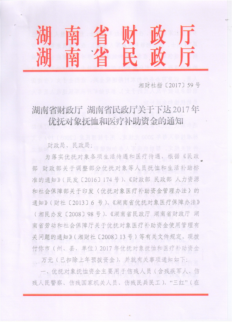 湖南省财政厅湖南省民政厅关于下达2017年优抚对象抚恤和医疗补助资金的通知