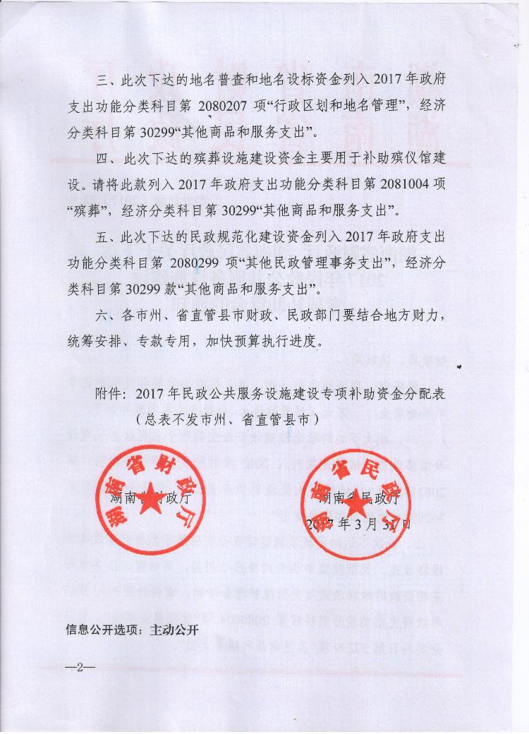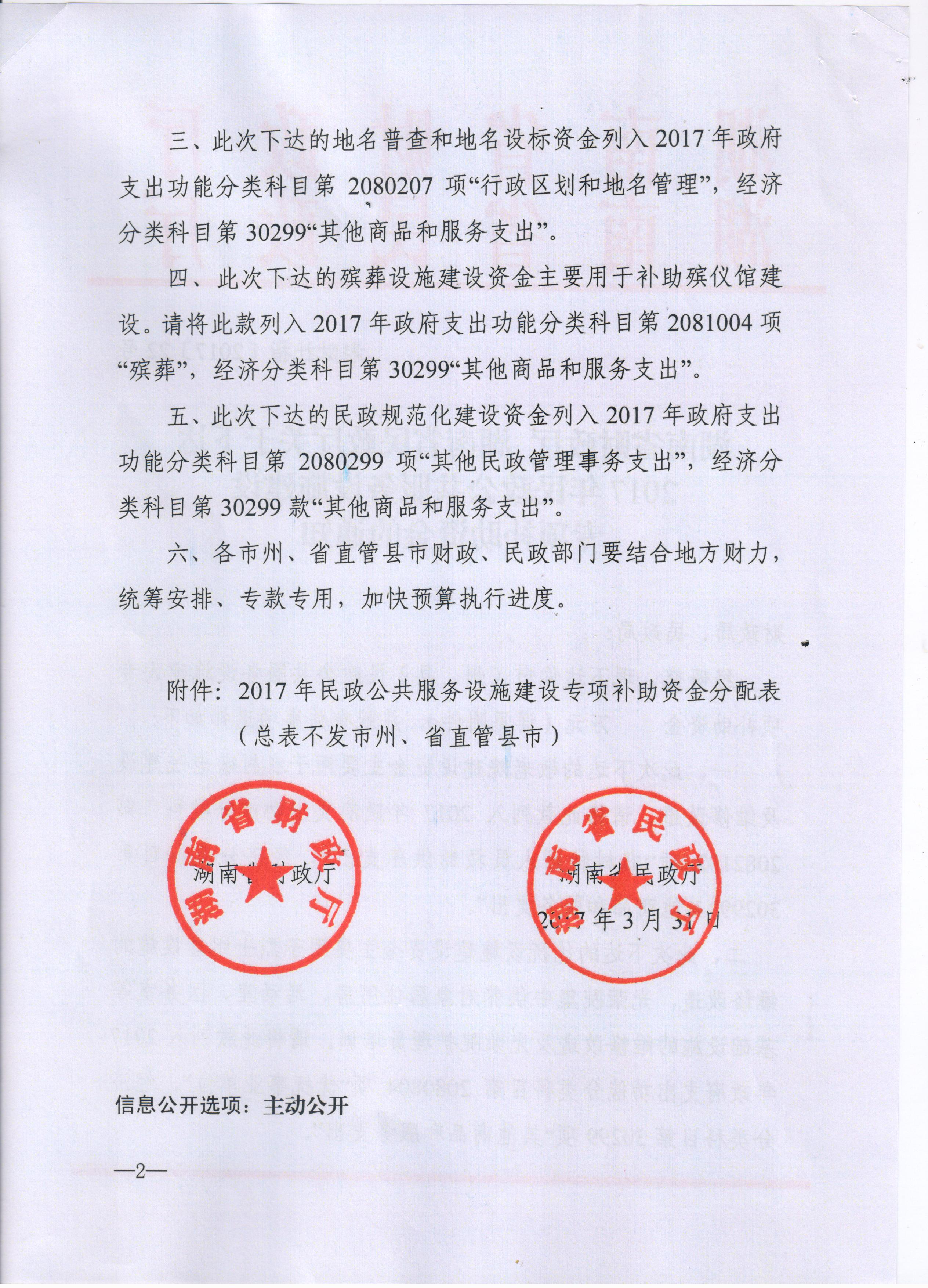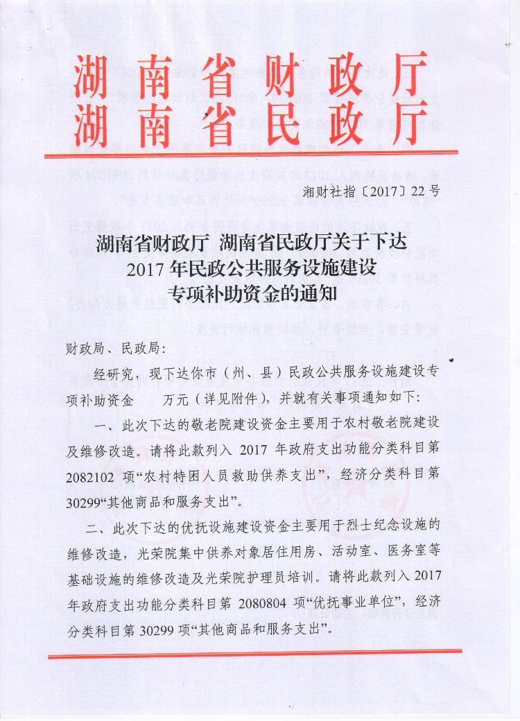 湖南省财政厅 湖南省民政厅关于下达2017年民政公共服务设施建设专项补助资金的通知