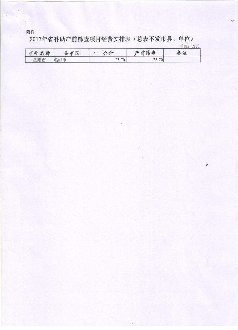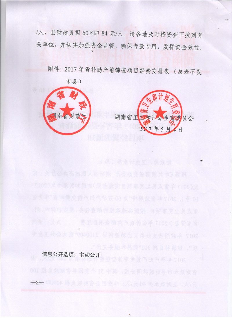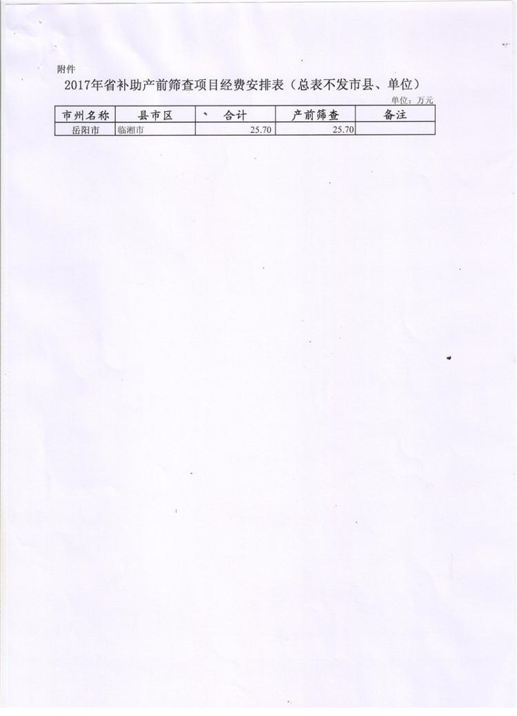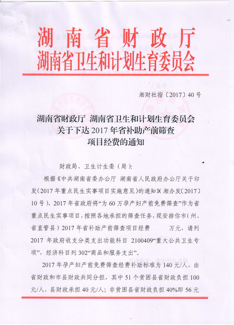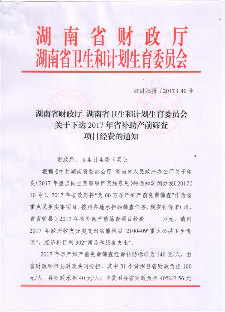 湖南省财政厅湖南厅卫生和计划生育委员会关于下达2017年省级补助产前筛查项目经费的通知