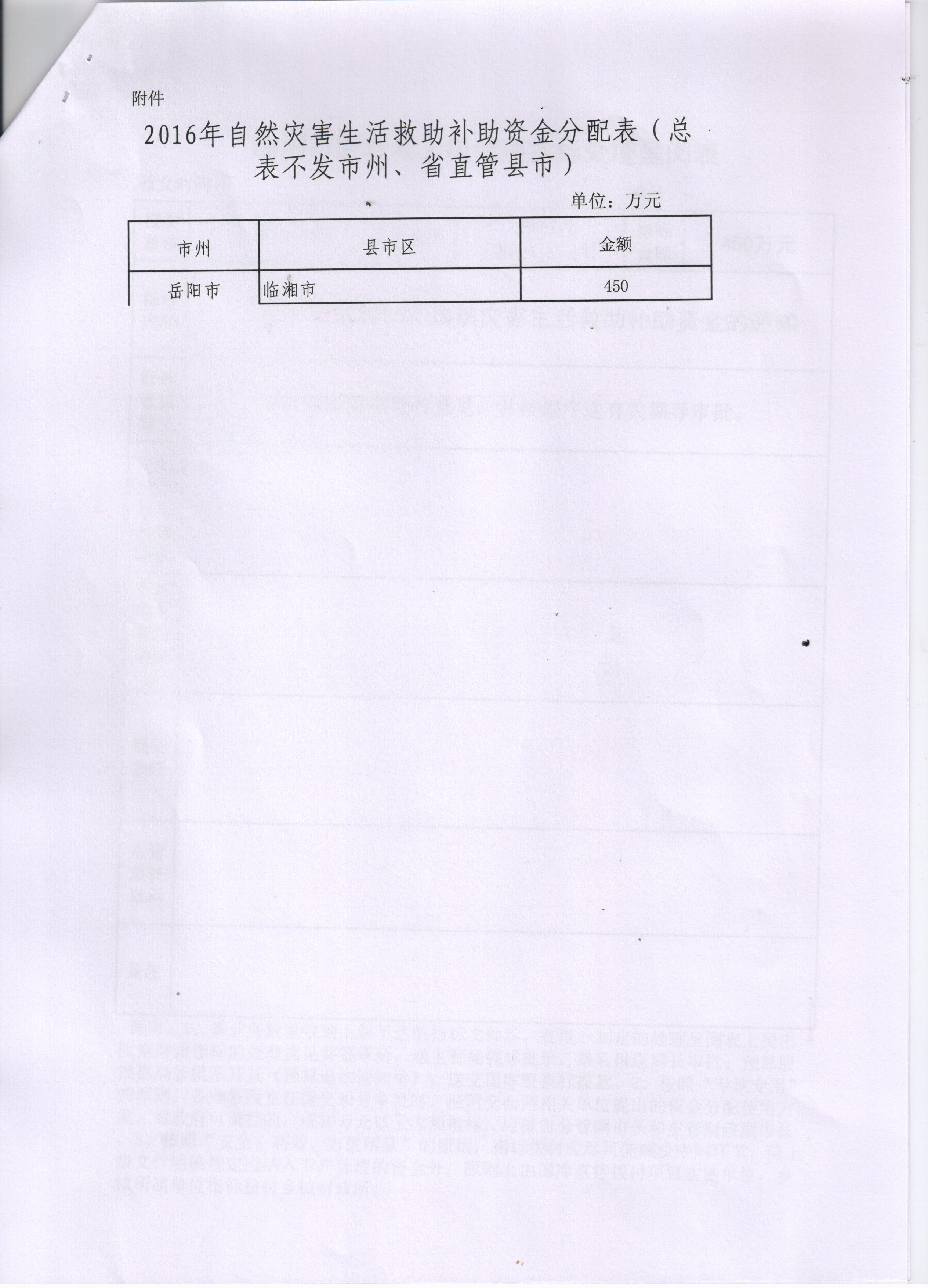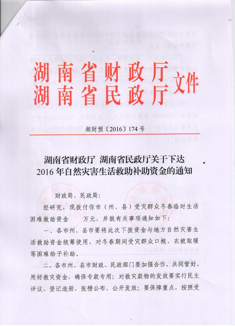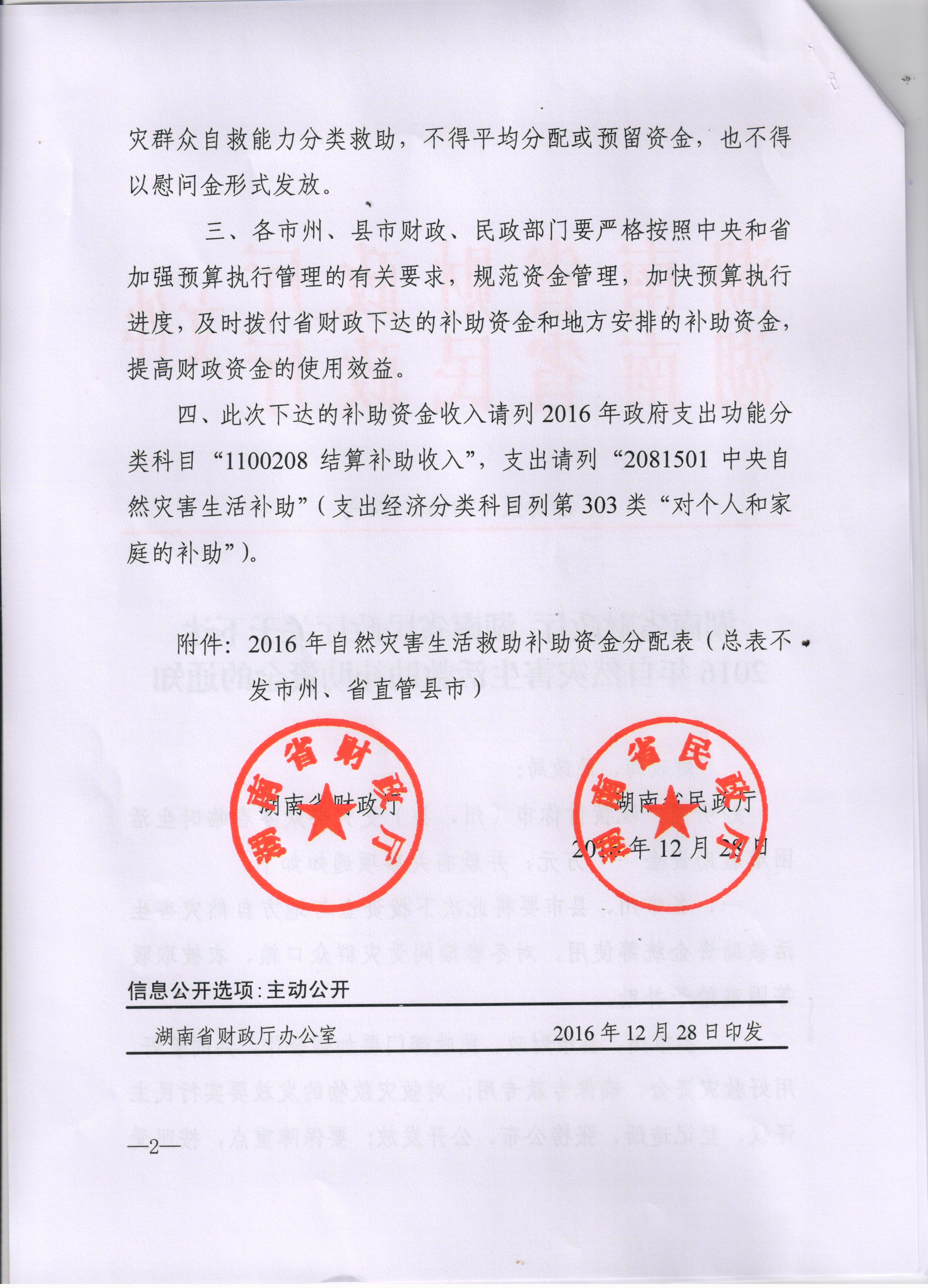 湖南省财政厅 湖南省民政厅关于下达2016年自然灾害生活救助补助资金的通知