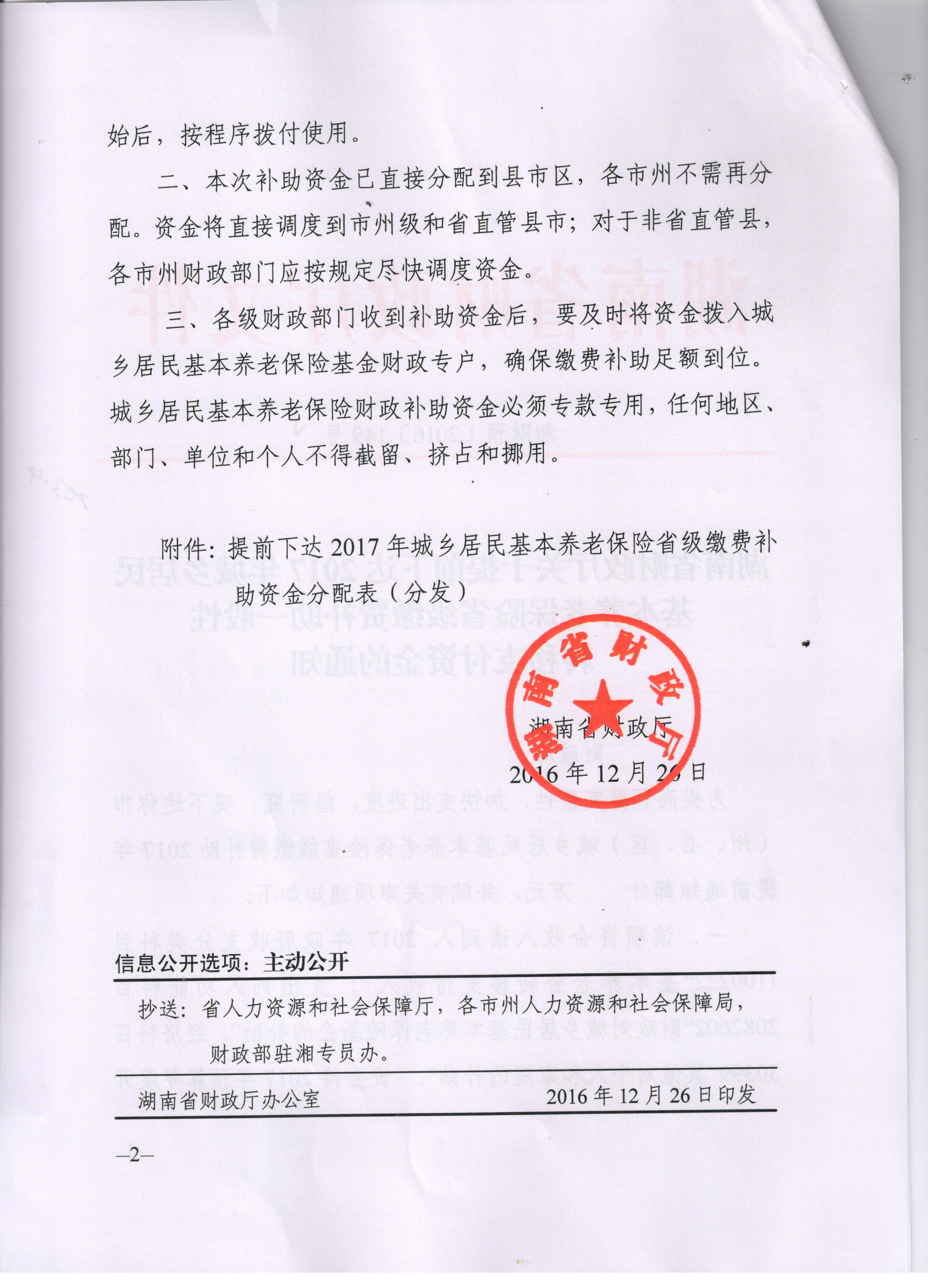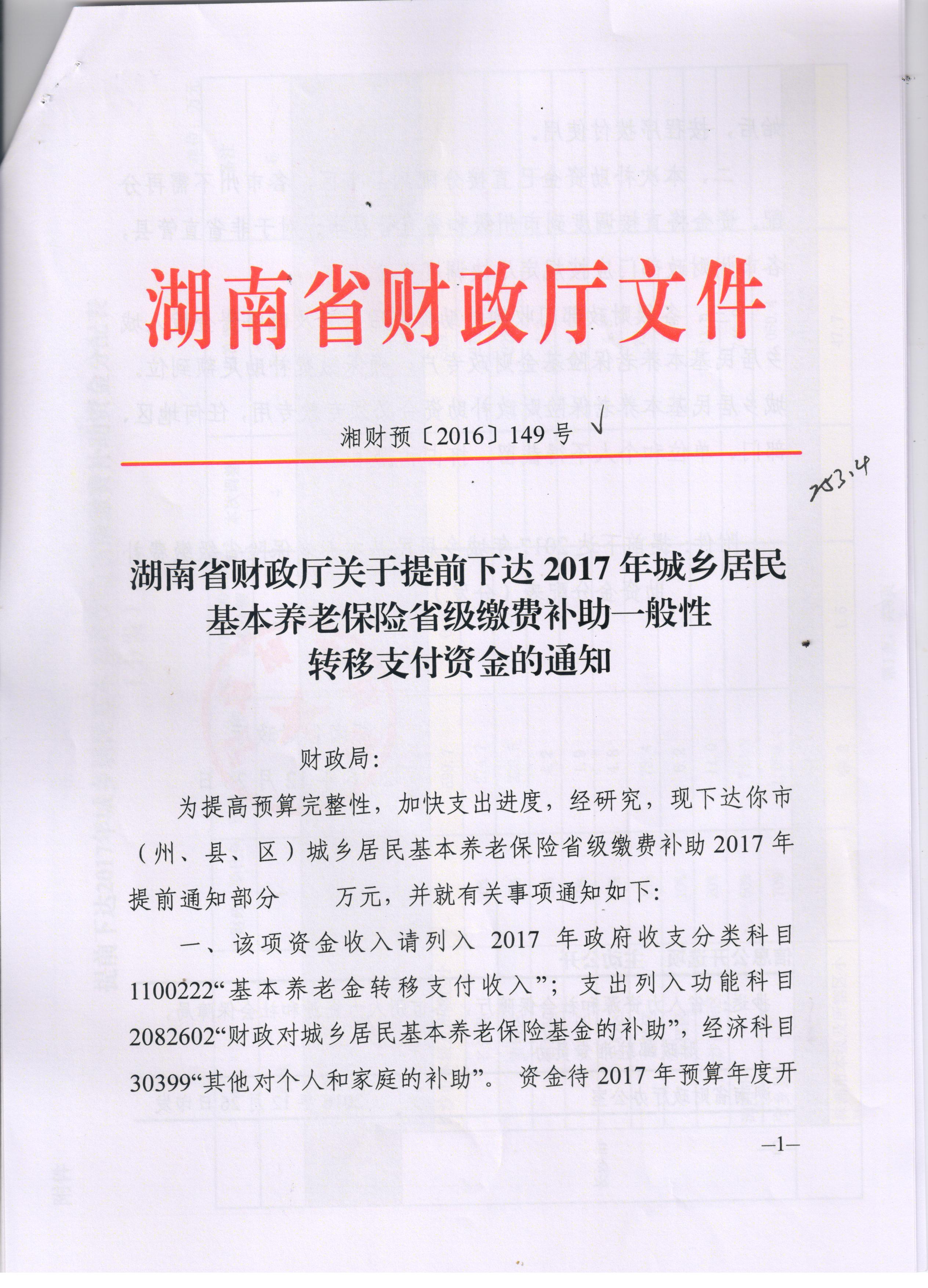 湖南省财政厅关于提前下达2017年城居民基本养老保险省级缴费补助一般性转移支付资金的通知