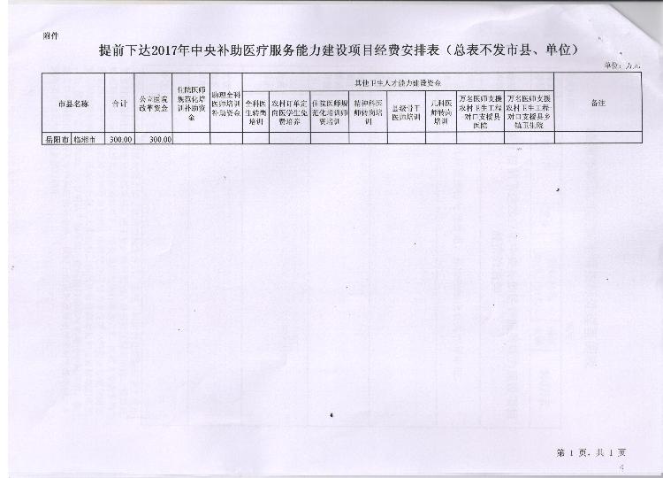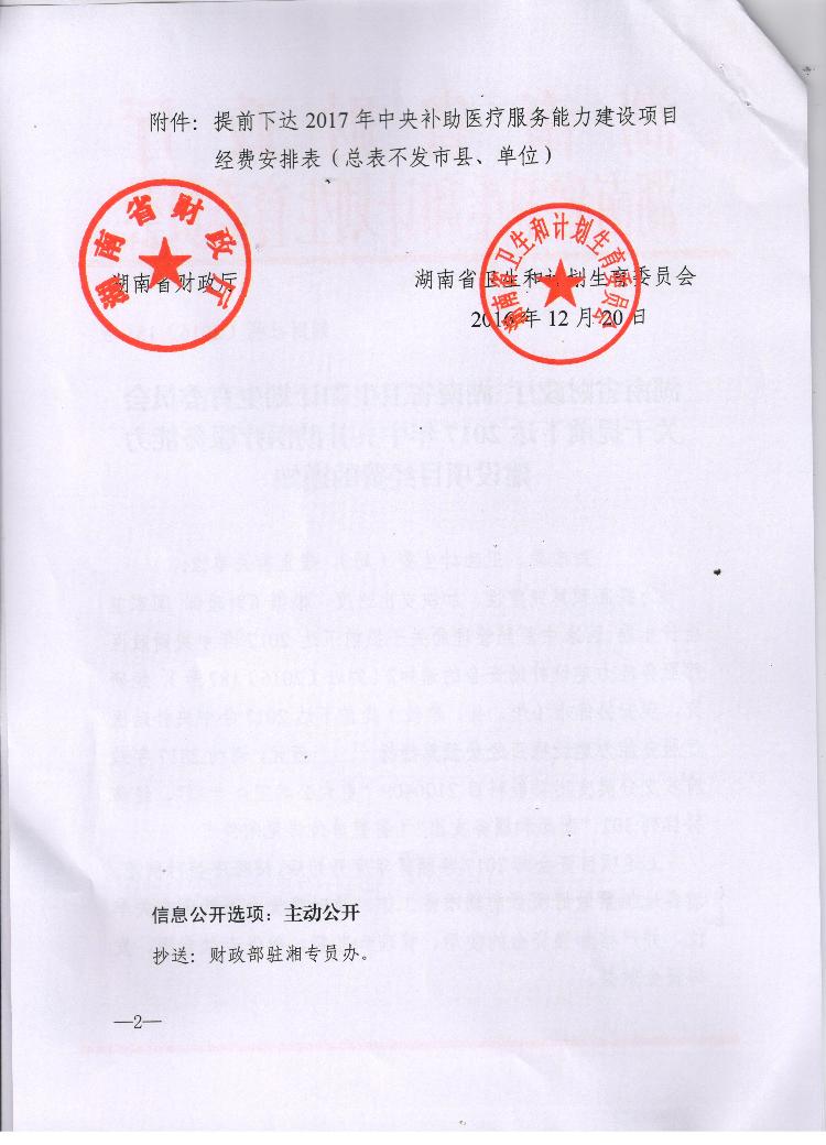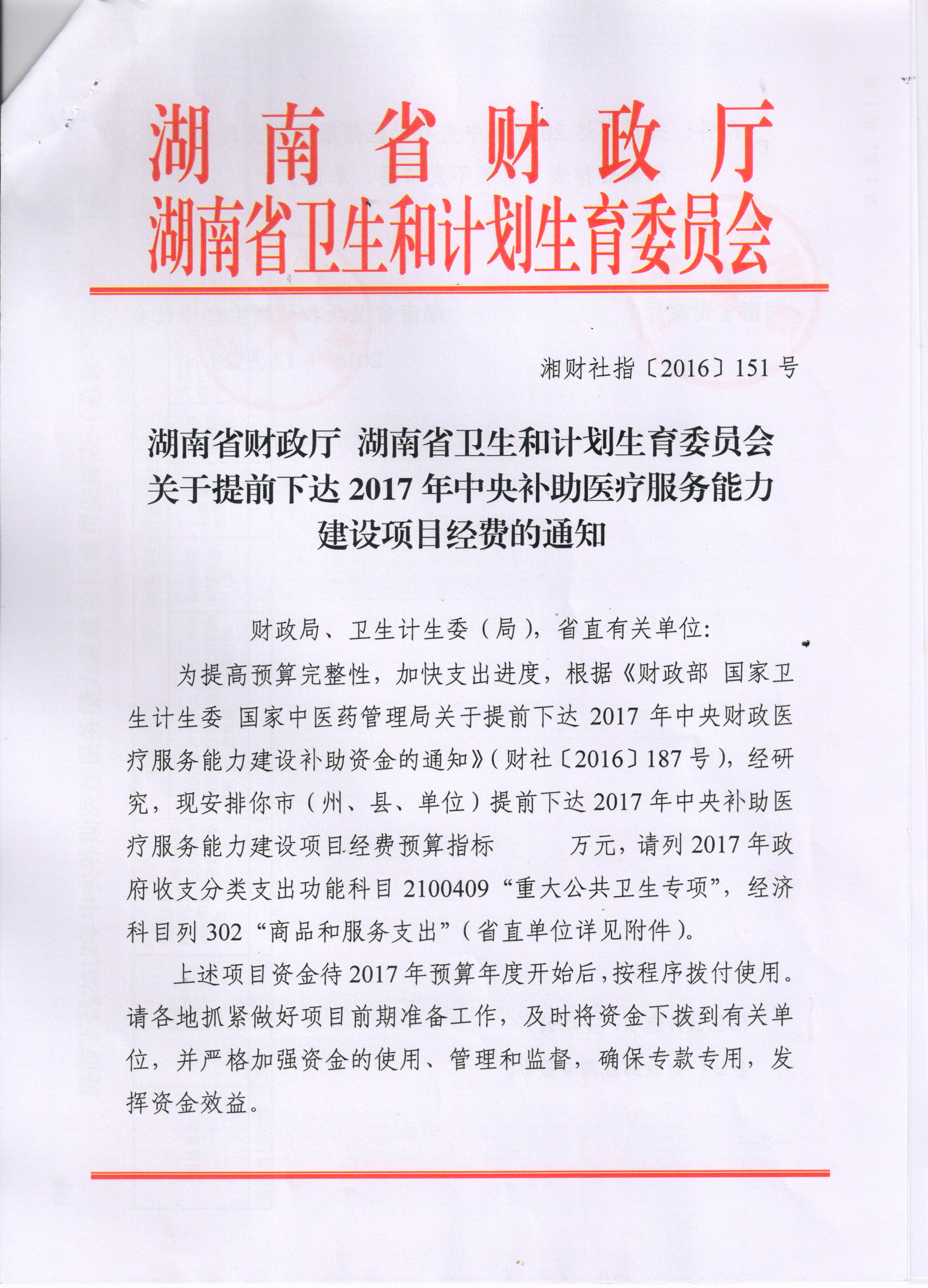 湖南省财政厅 湖南省卫生和计划生育委员会关于提前下达2017年中央补助医疗服务能力建设项目经费的通知