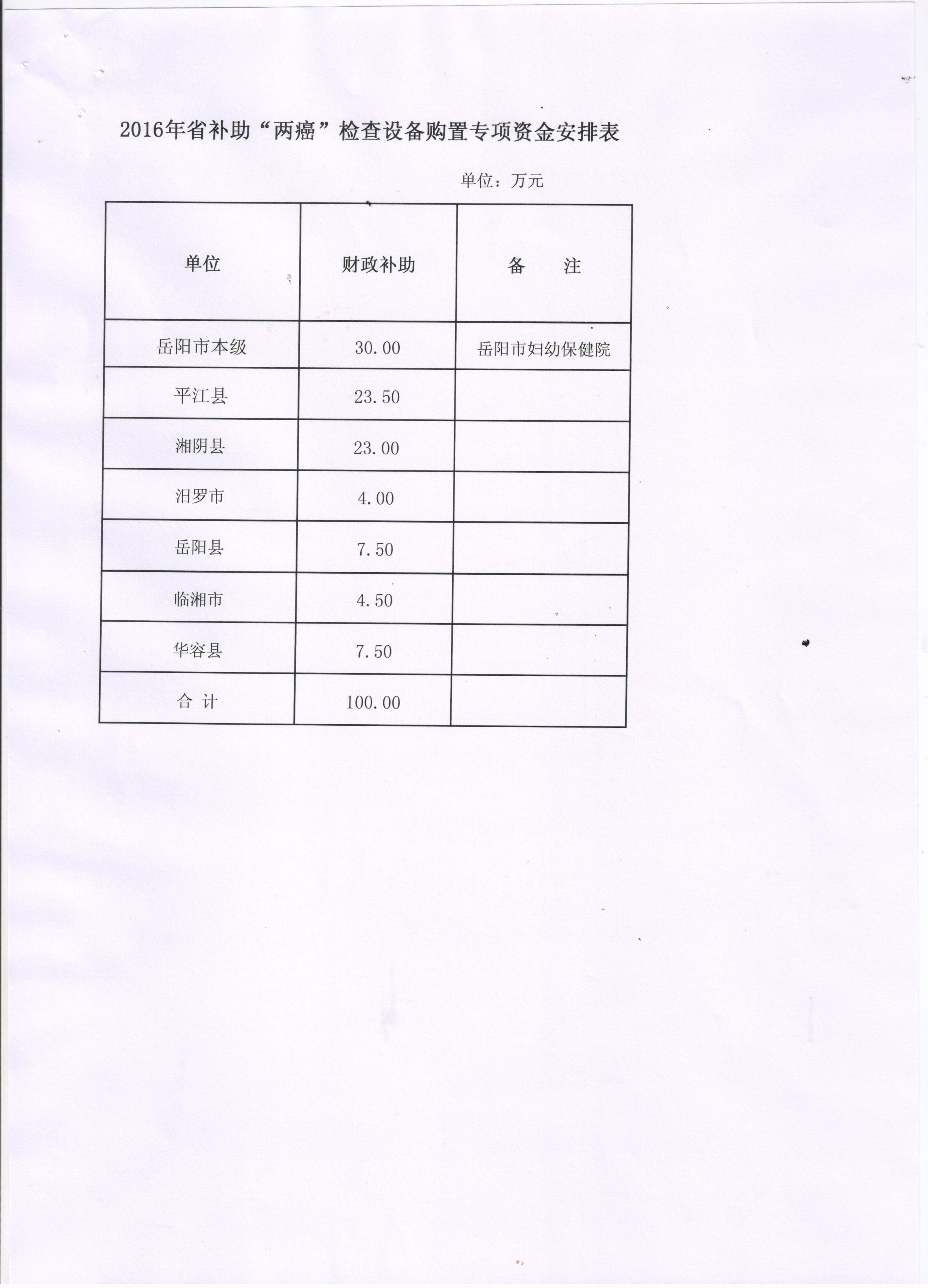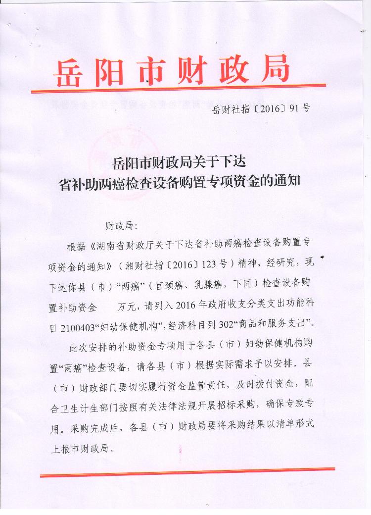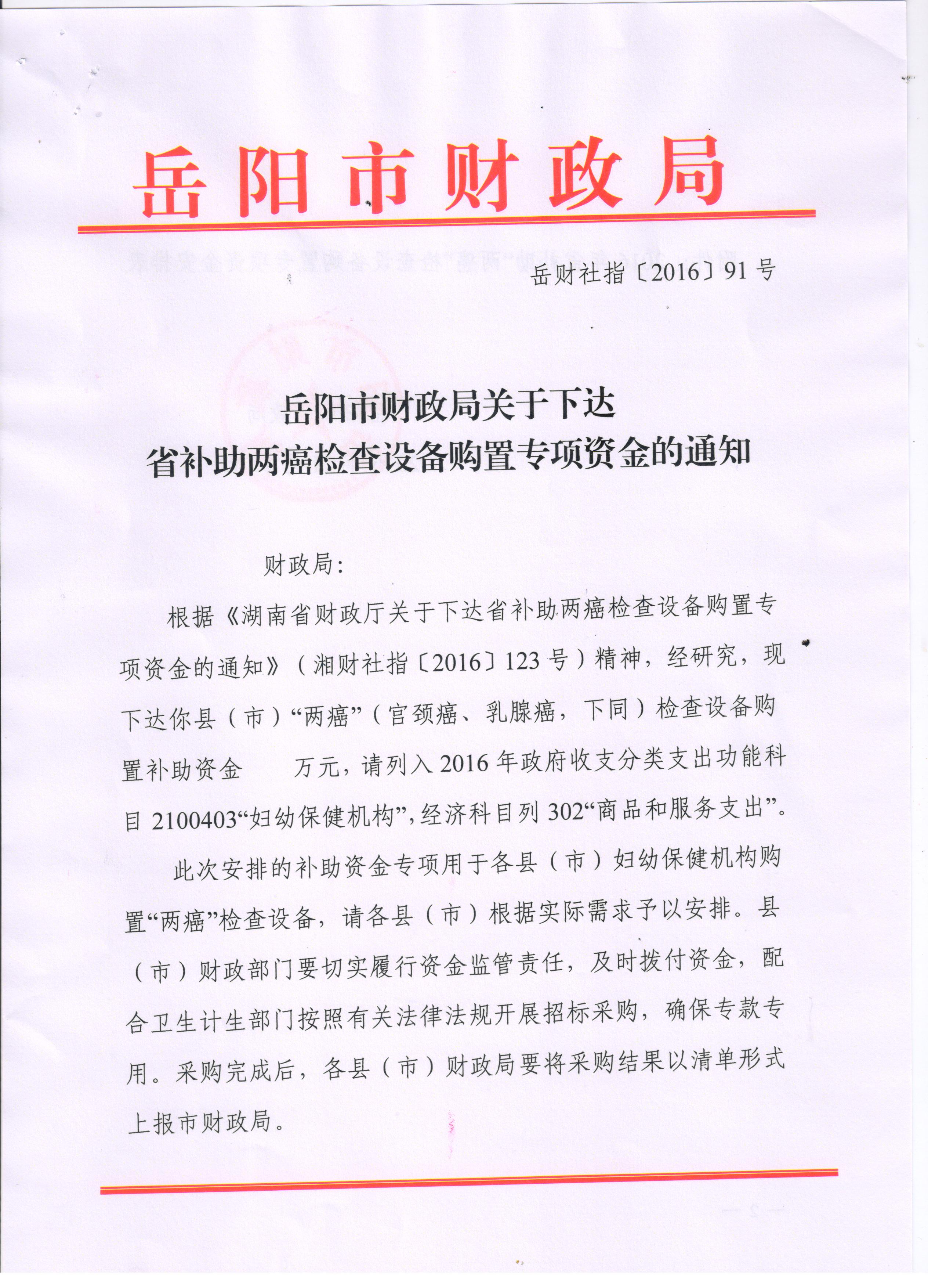岳阳市财政局关于下达省补助两癌检查设备购置专项资金的通知