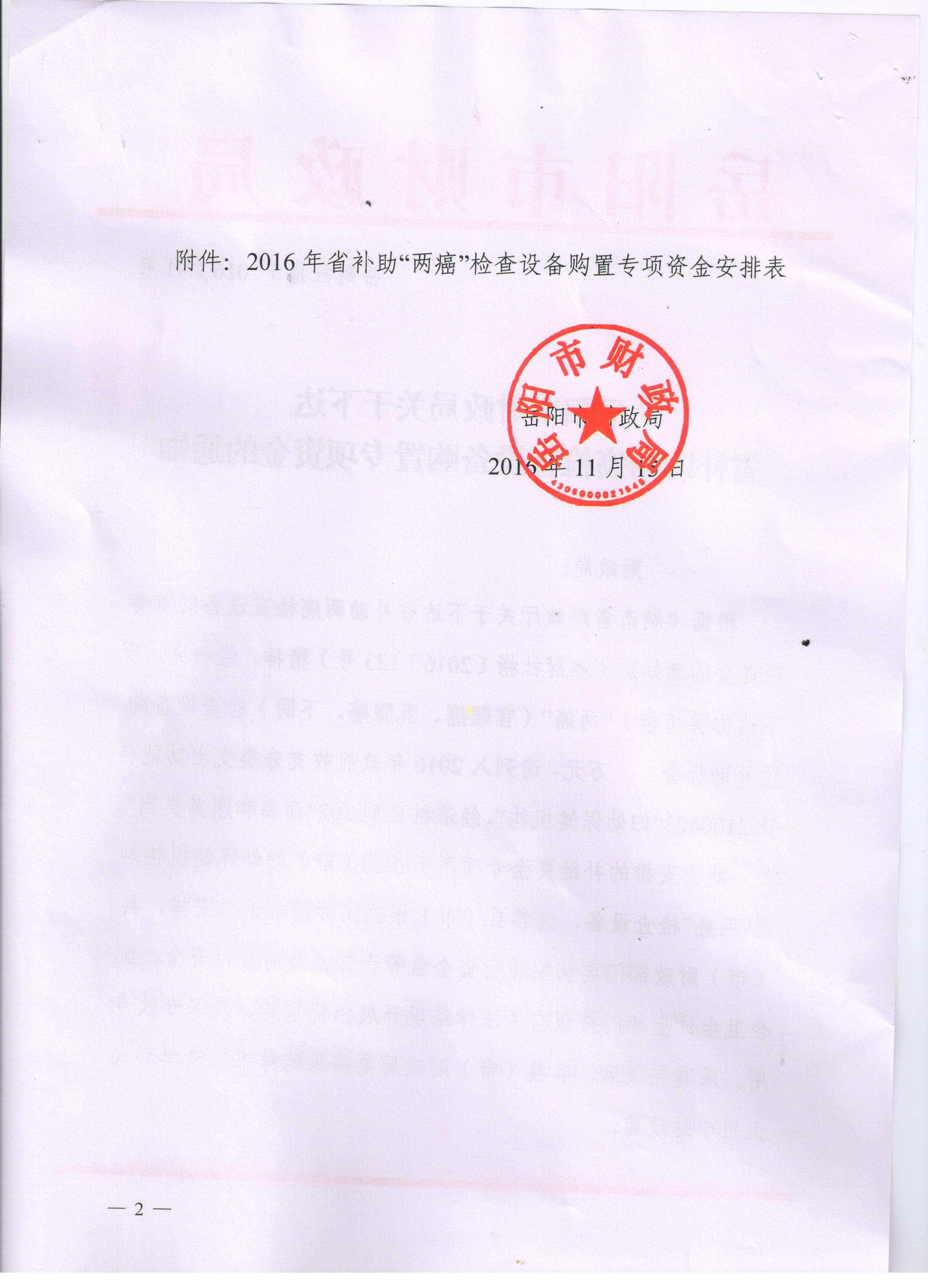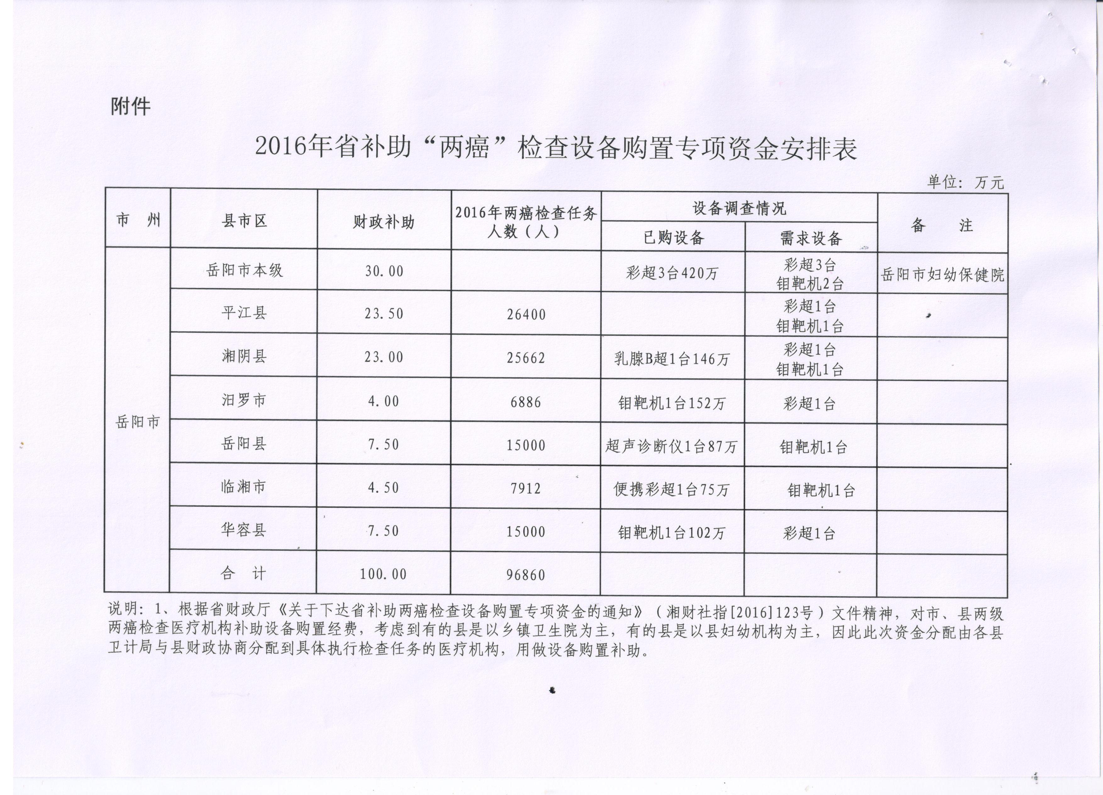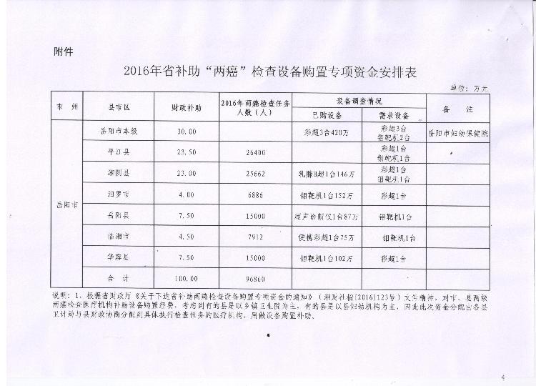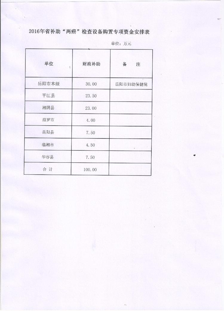 岳阳市财政局关于下达省补助两癌检查设备购置专项资金的通知