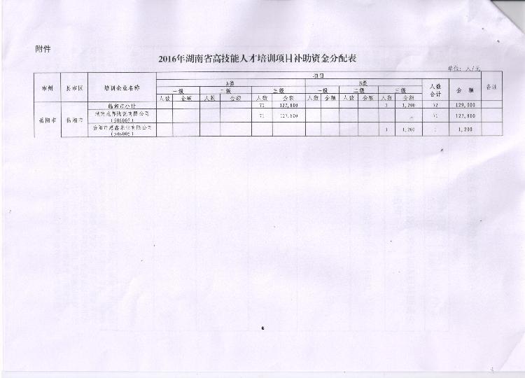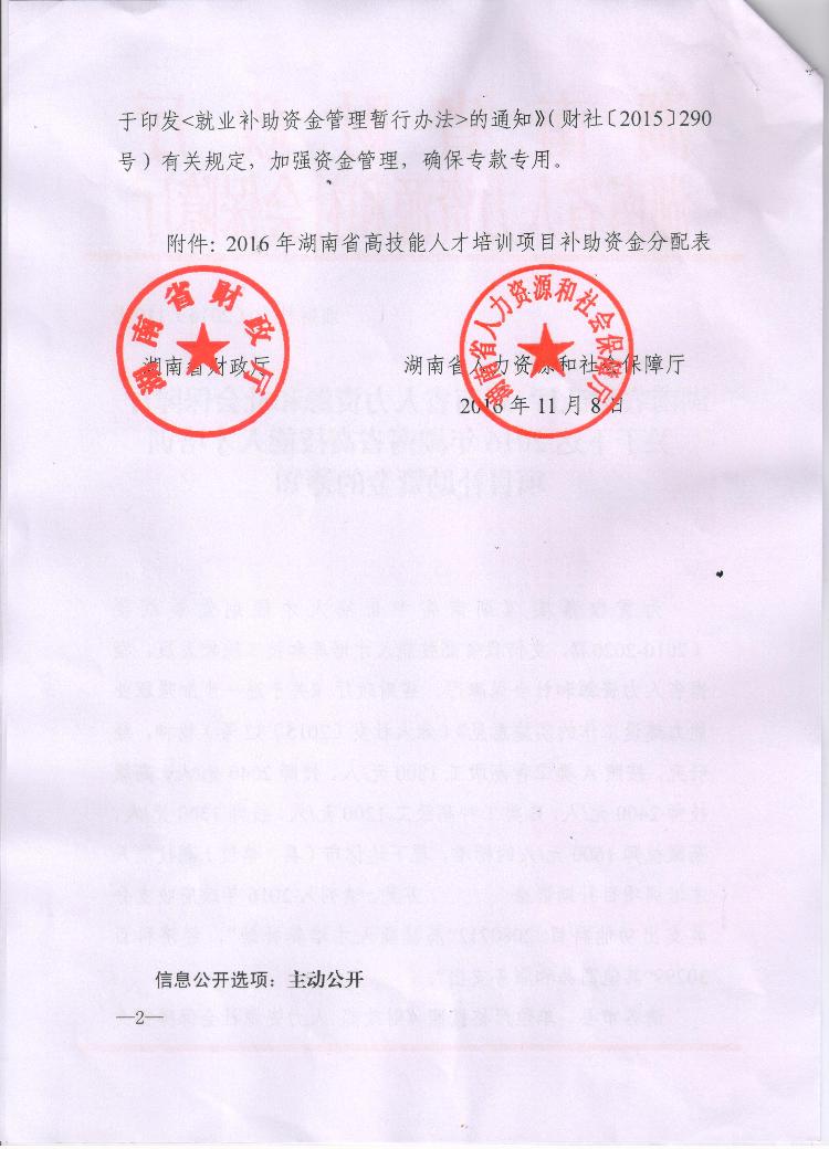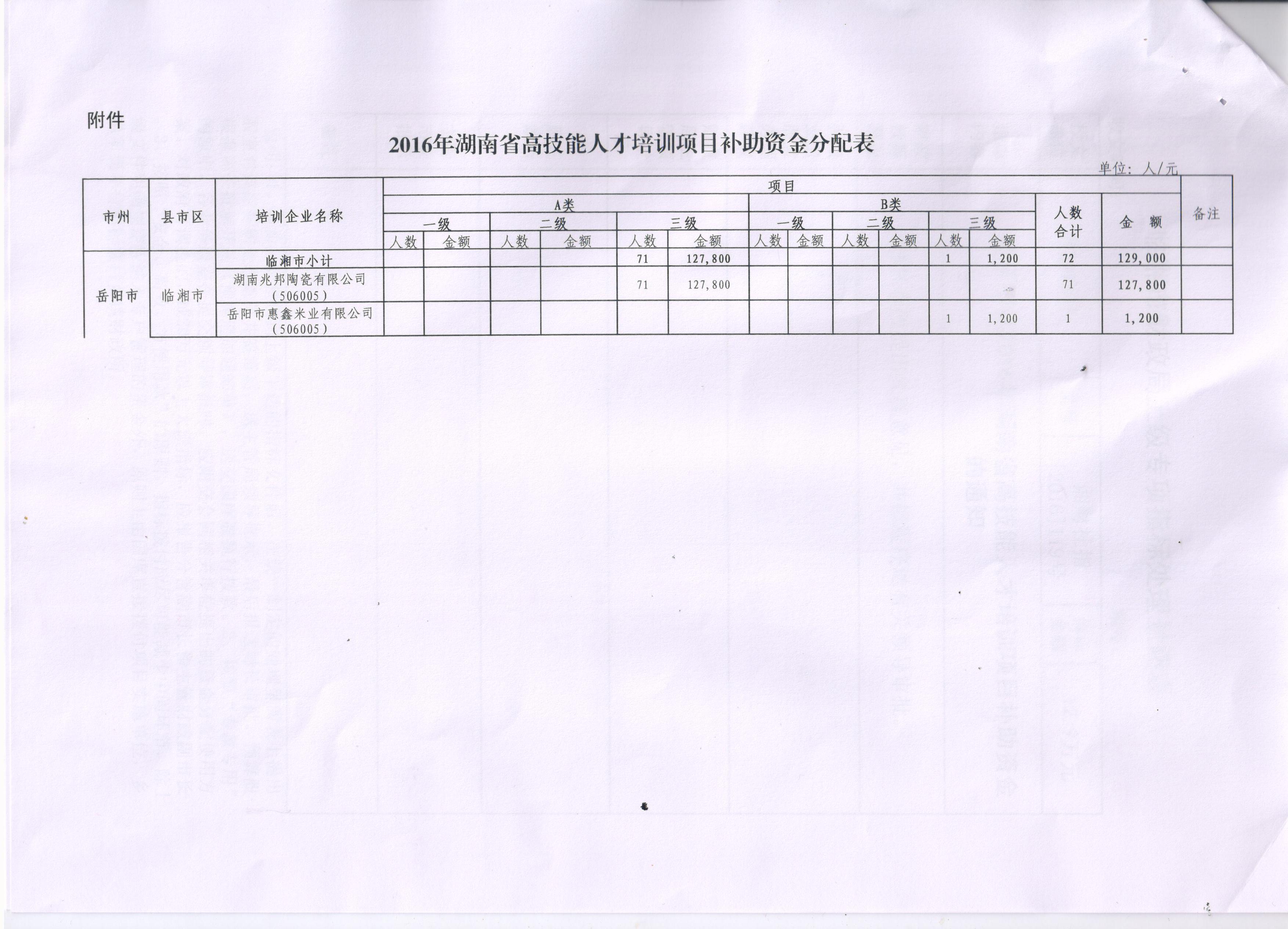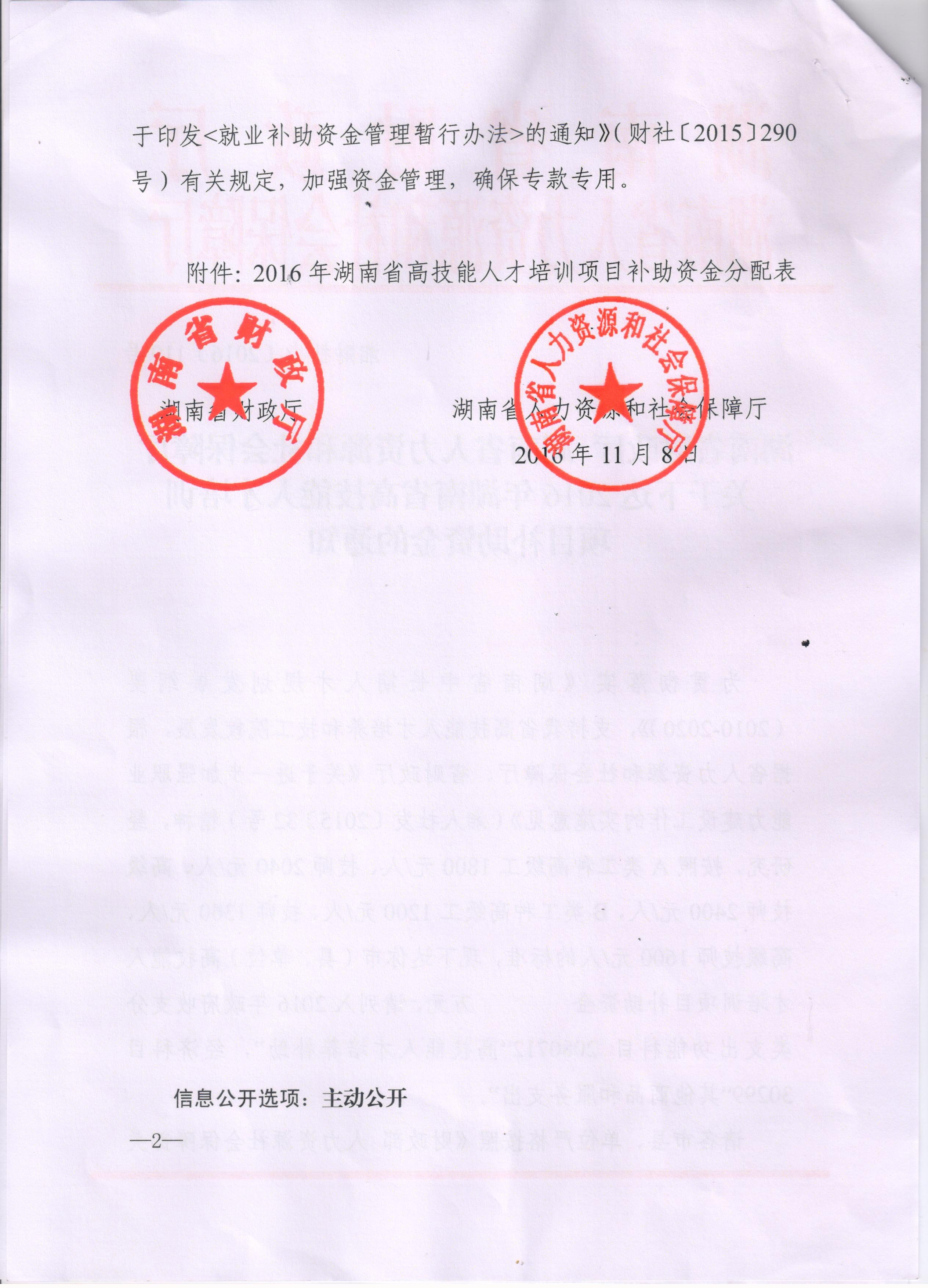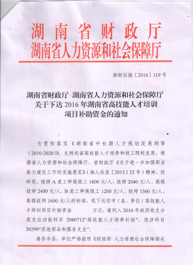 湖南省财政厅 湖南省人力资源和社会保障厅关于下达2016年高技能人才培训项目补助资金的通知