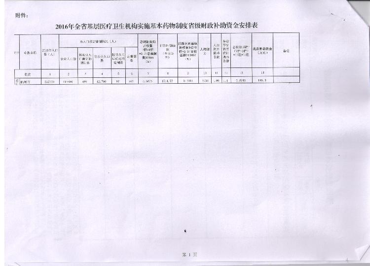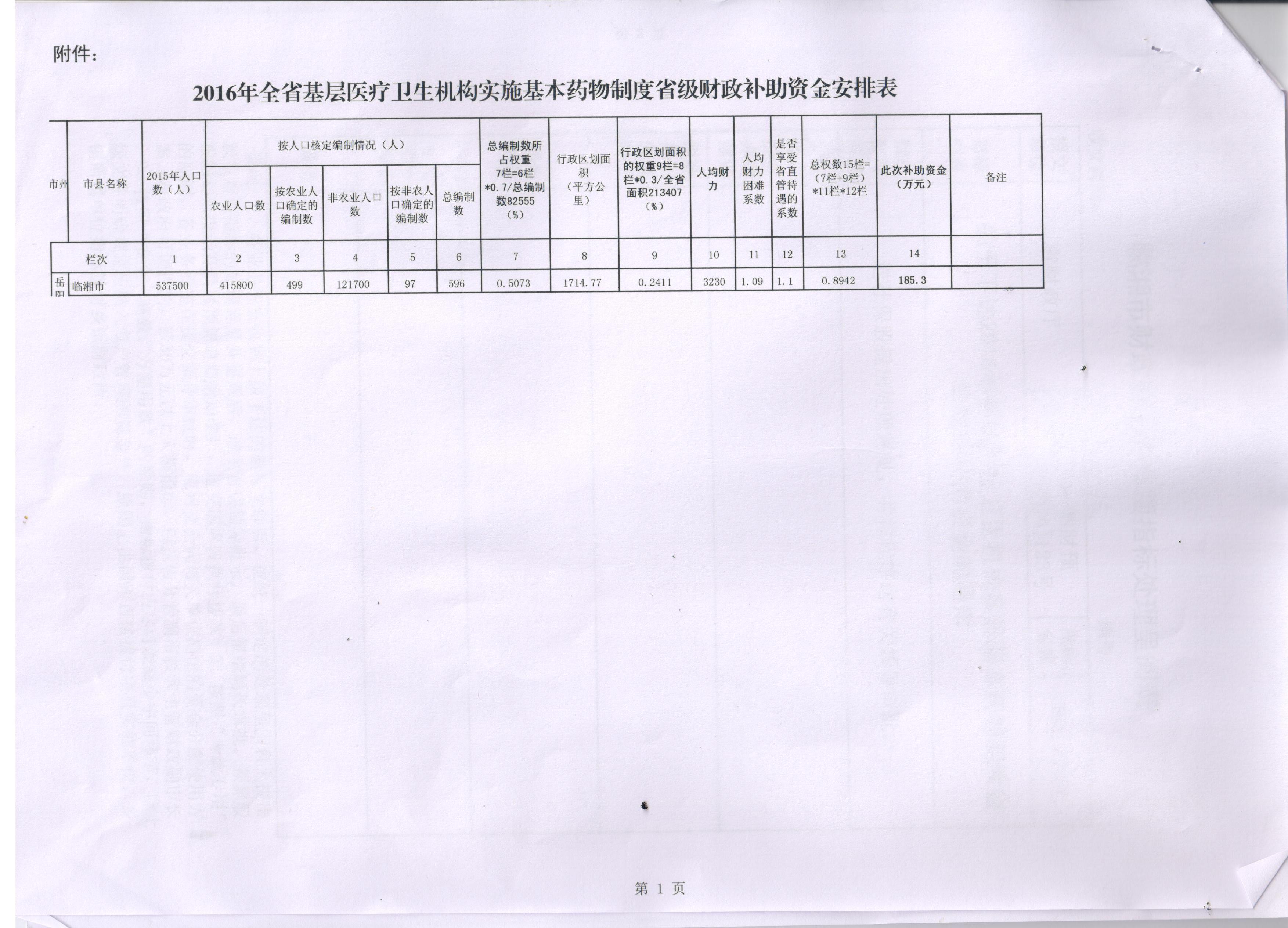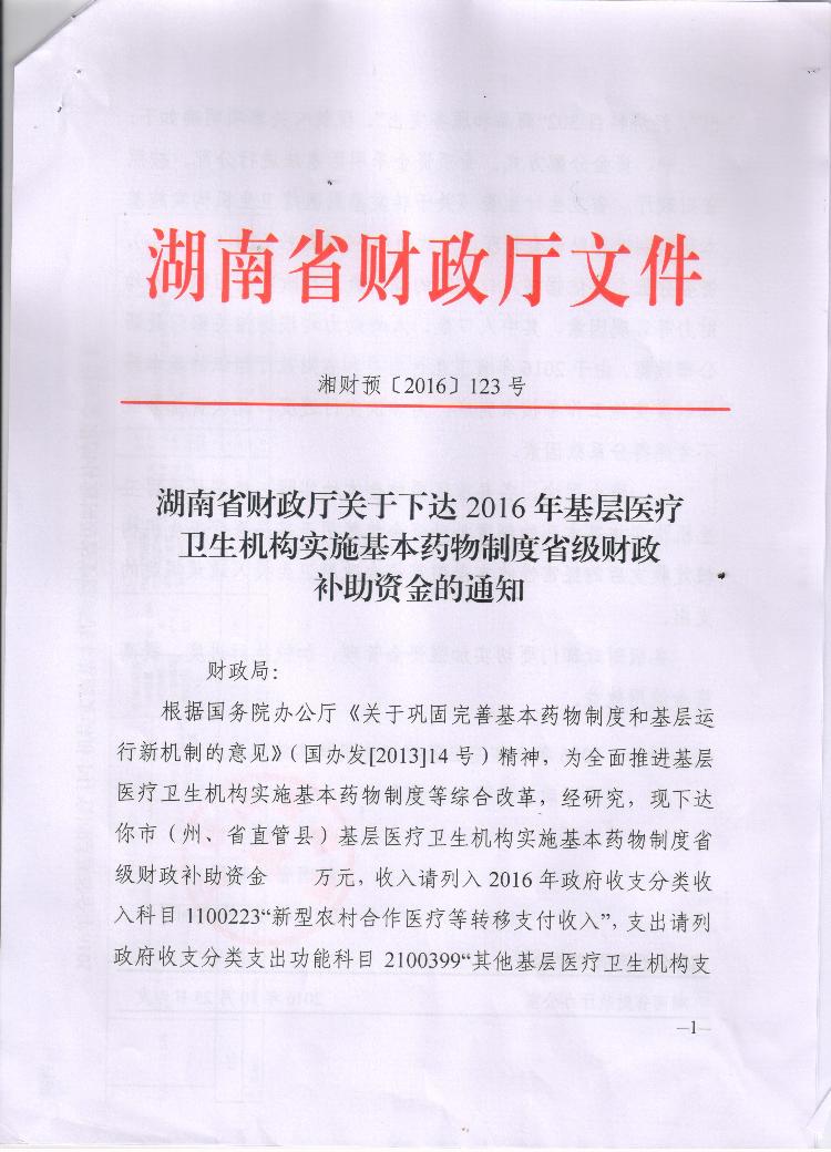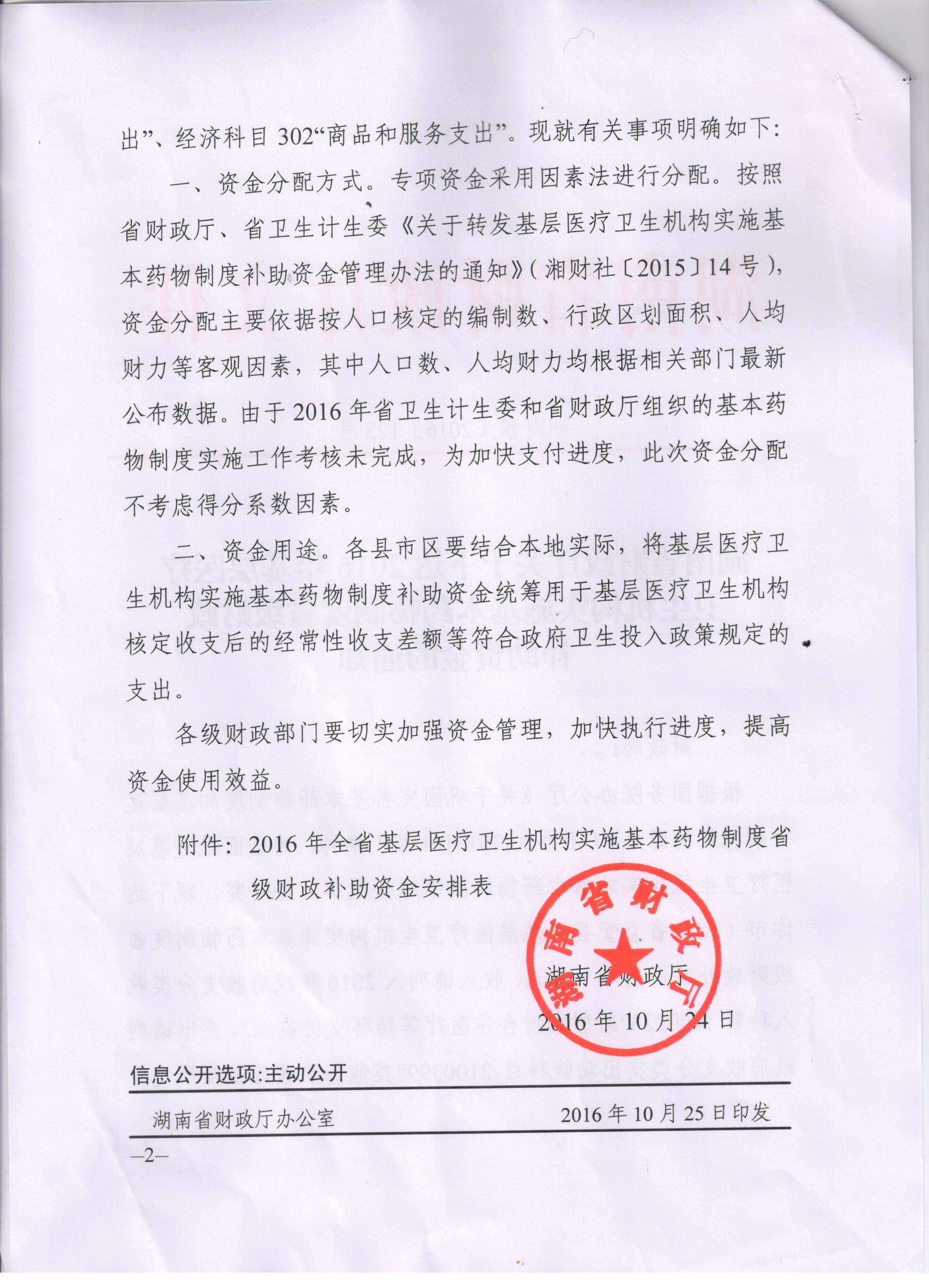湖南省财政厅关于下达2016年基本医疗卫生机构实施基本药物制度省级财政补助资金的通知