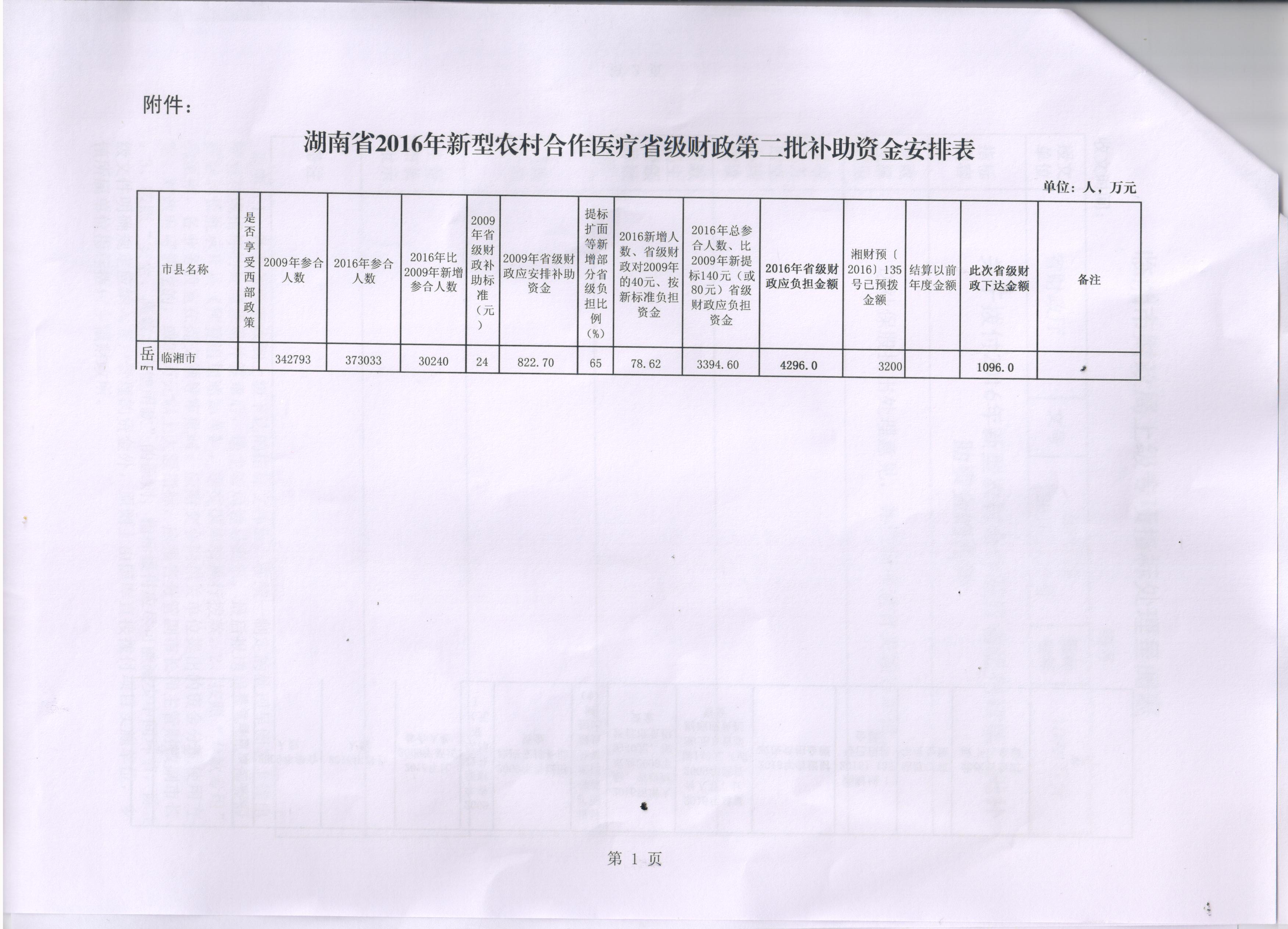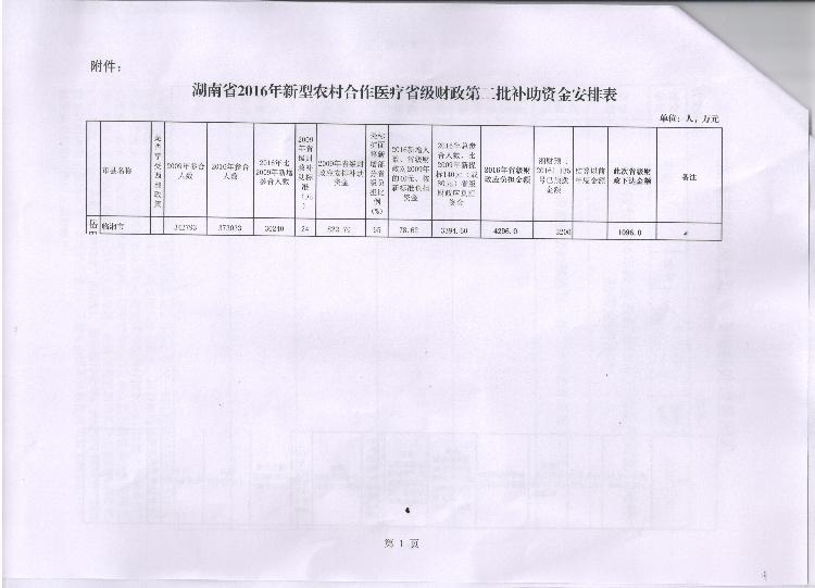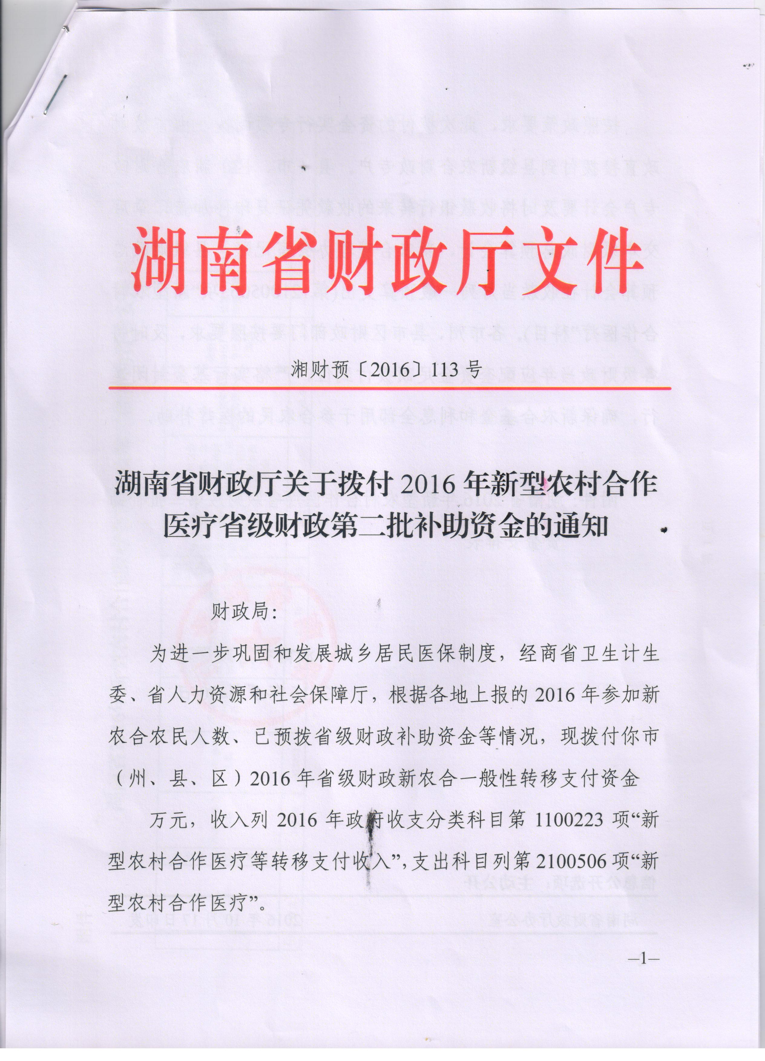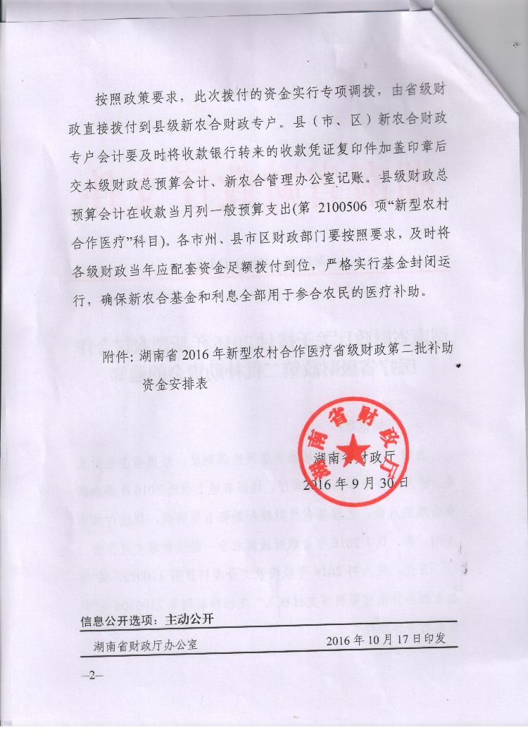 湖南省财政厅关于拨付2016年新型农村合作医疗省级财政第二批补助资金的通知