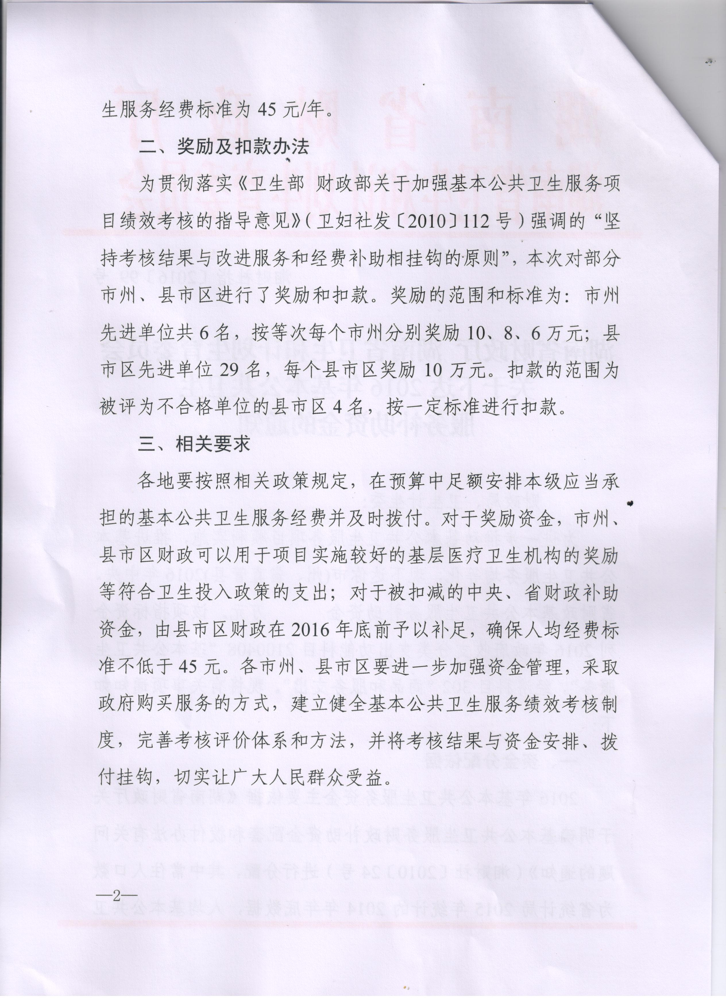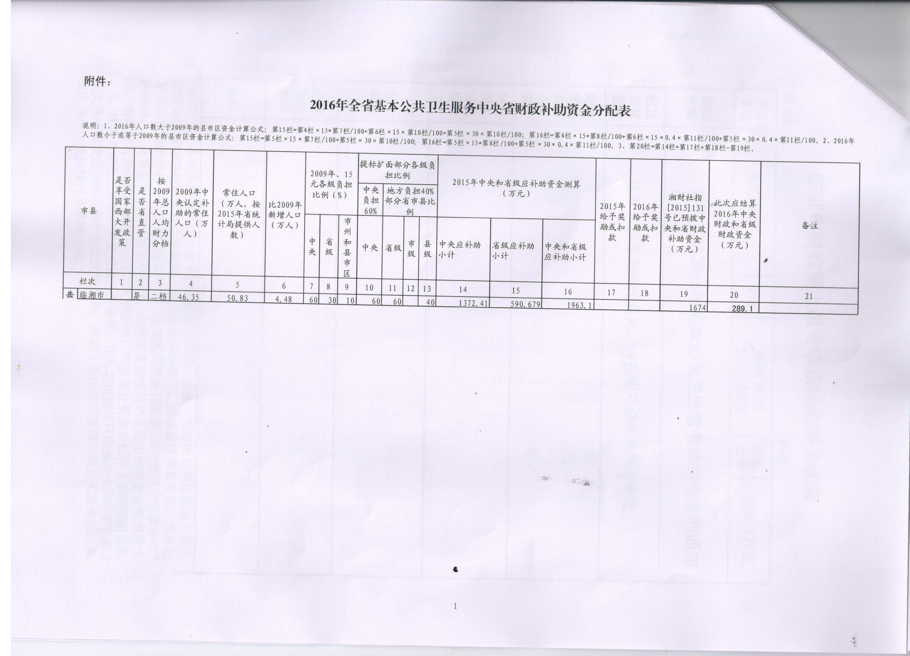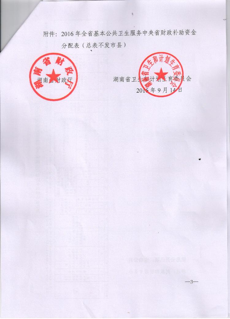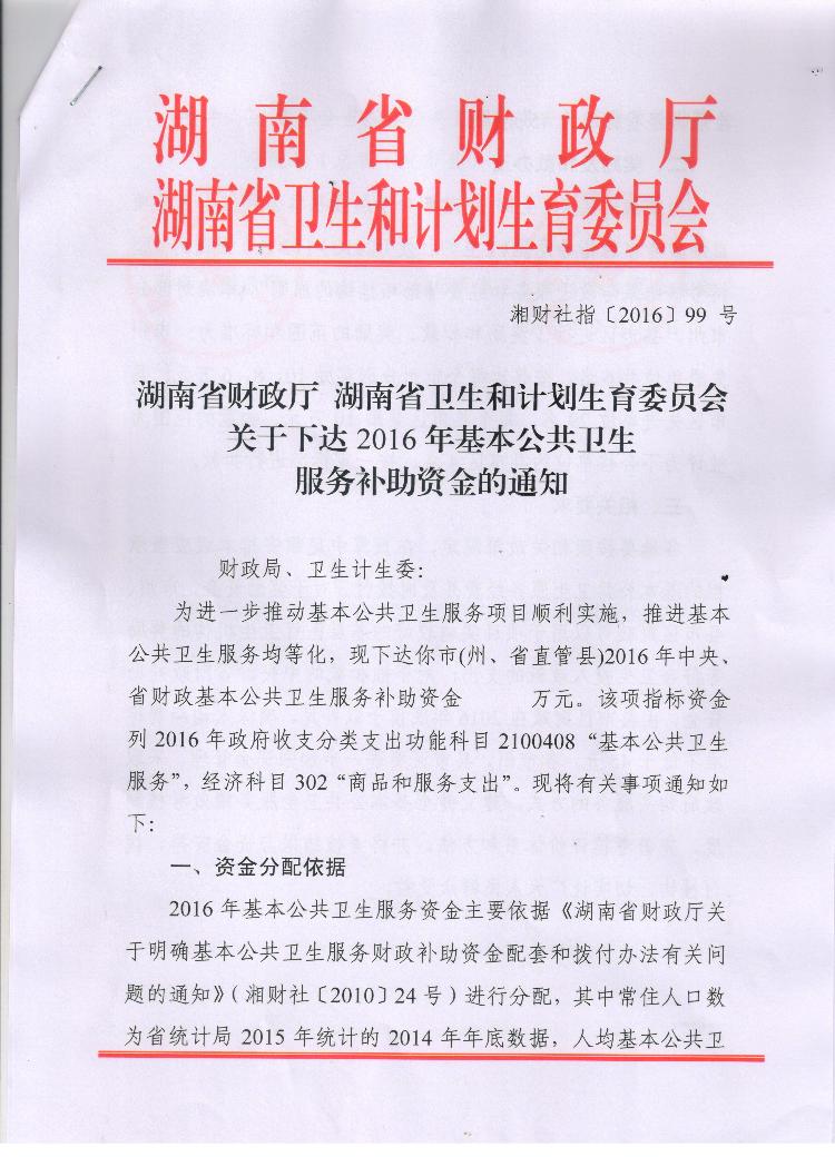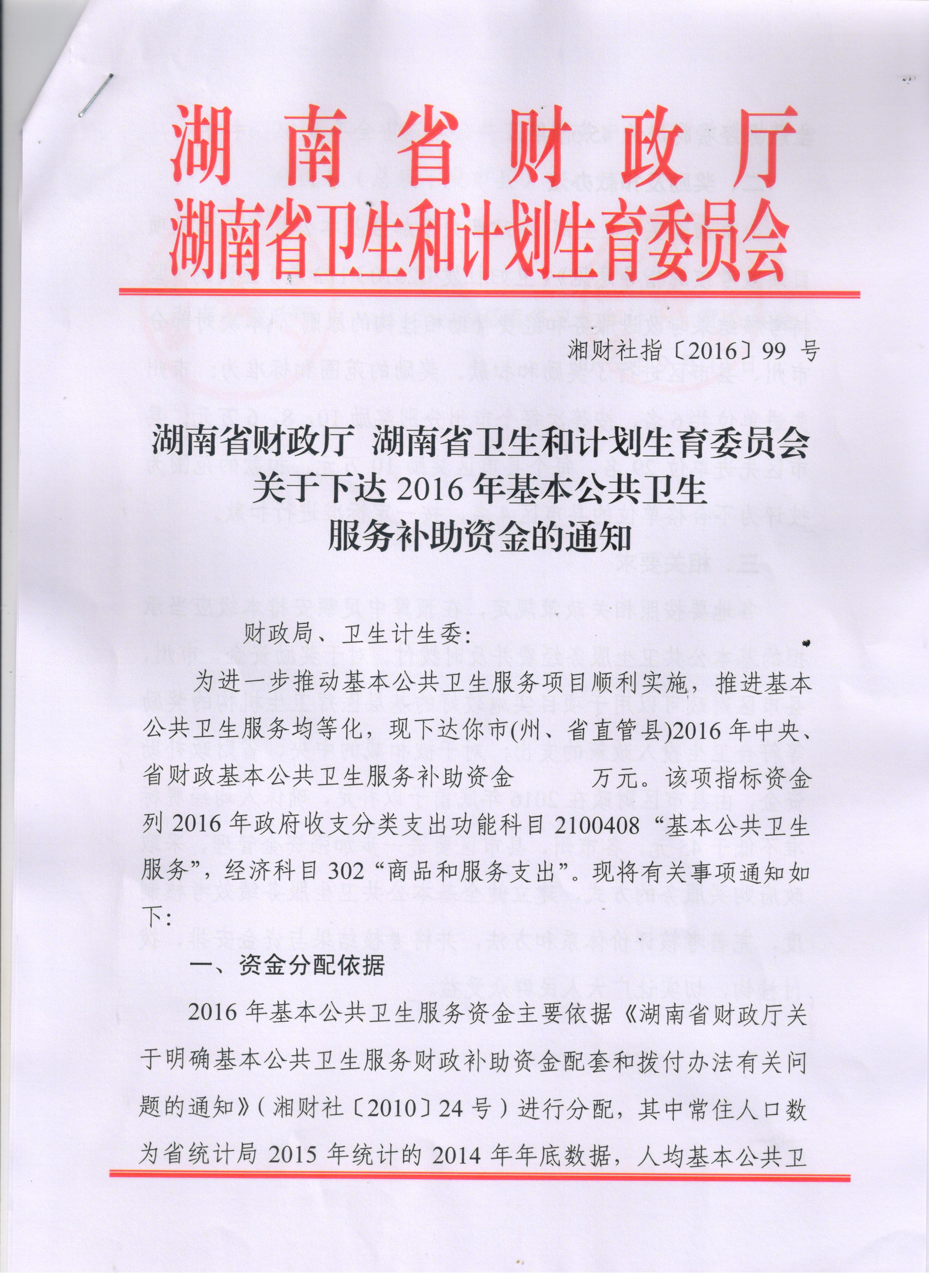 湖南省财政厅 湖南省卫生和计划生育委员会关于下达2016年基本公共卫生服务补助资金的通知