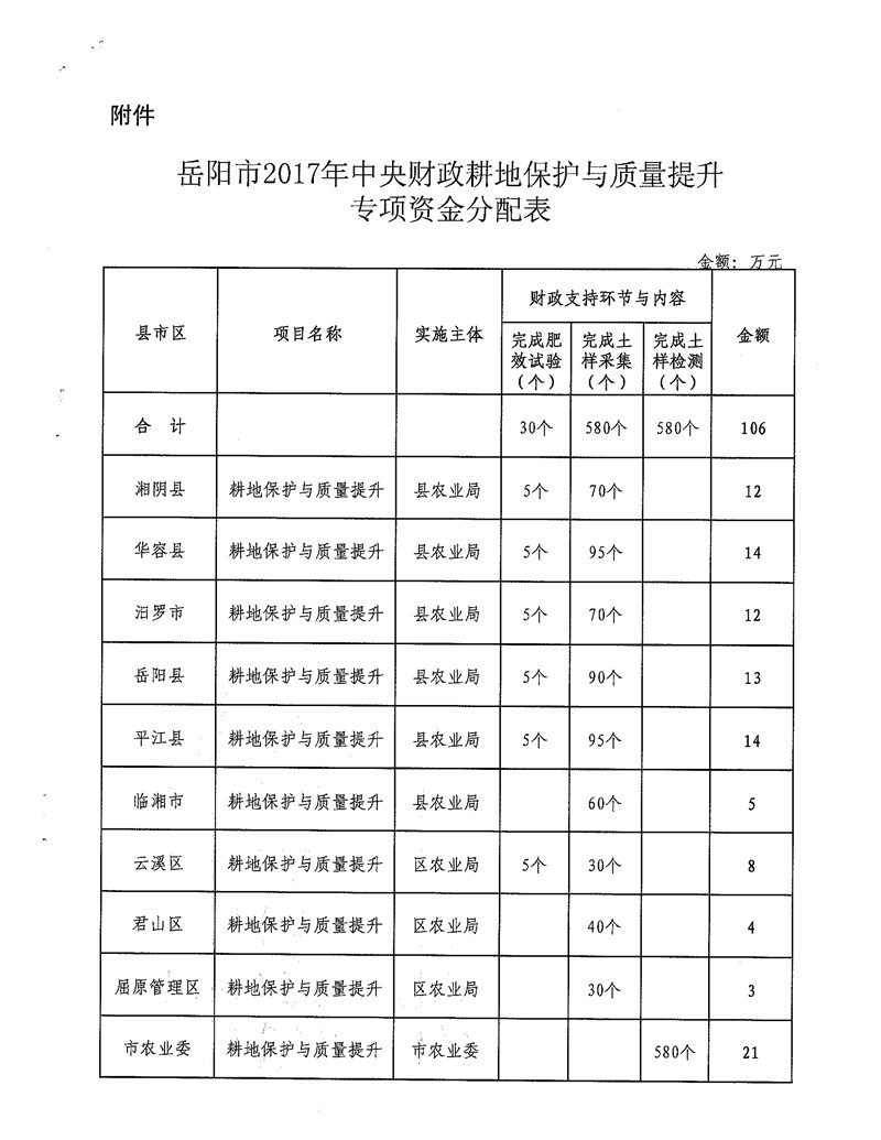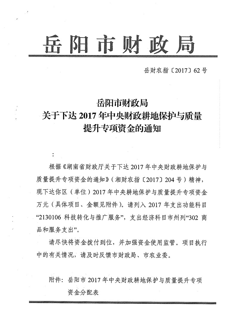 岳阳市财政局关于下达2017年中央财政耕地保护与质量提升专项资金的通知