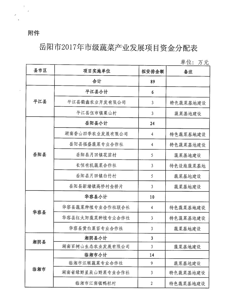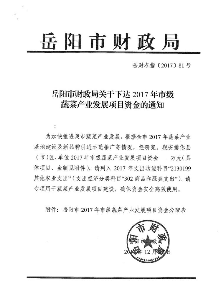 岳阳市财政局关于下达2017年市级蔬菜产业发展项目资金的通知