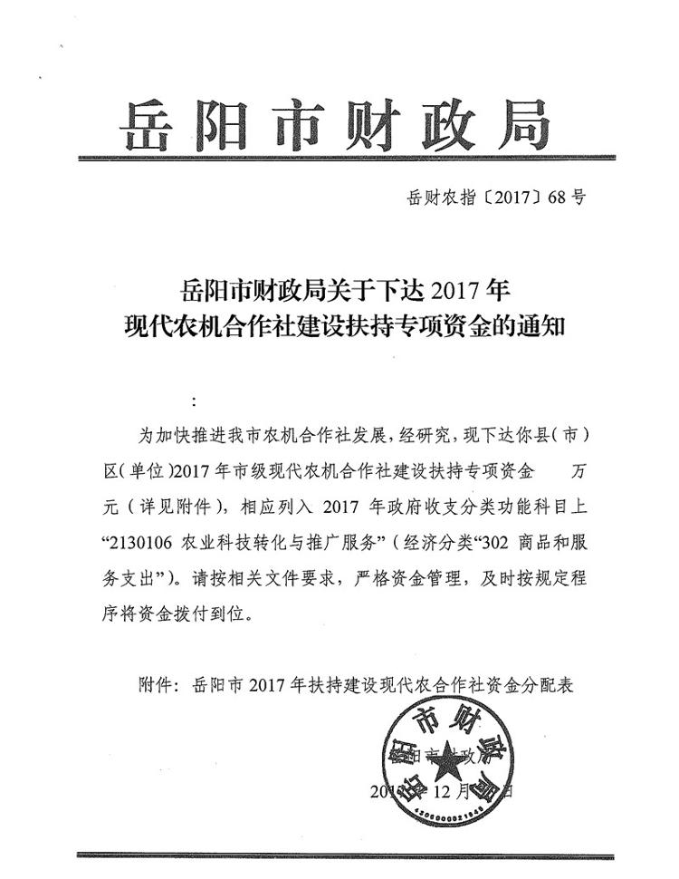 岳阳市财政局关于下达2017年现代农机合作社建设扶持专项资金的通知