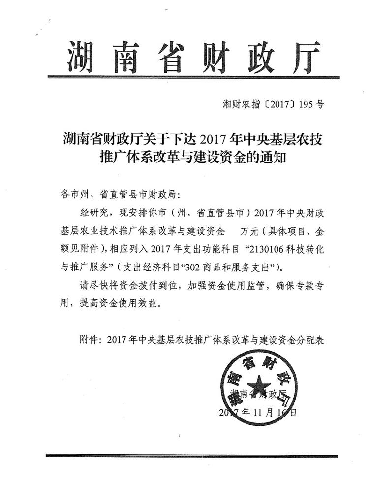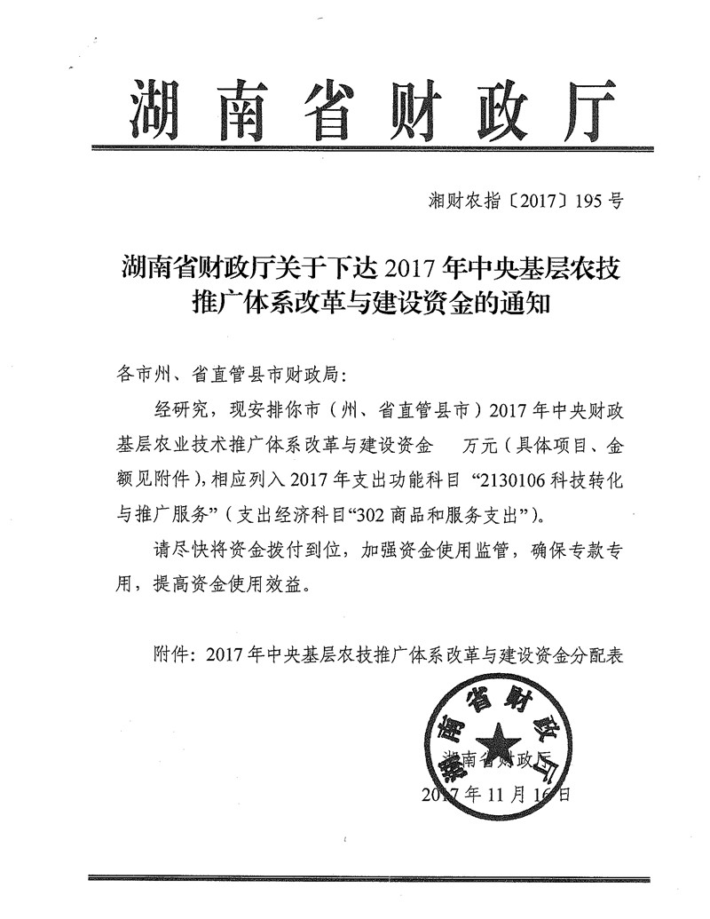 湖南省关于下达2017年中央基层农技推广体系改革与建设资金的通知