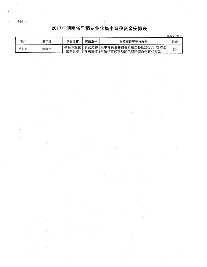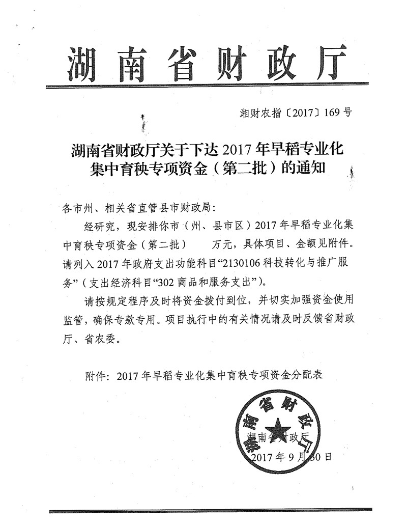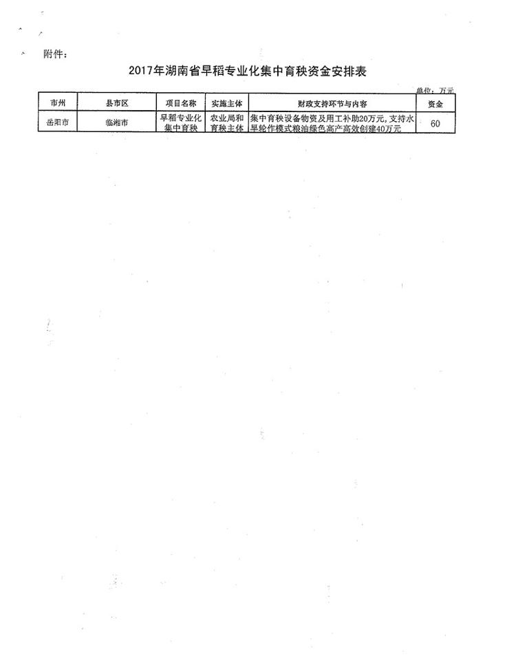 湖南省财政厅关于下达2017年早稻专业化集中育秧专项资金(第二批)的通知