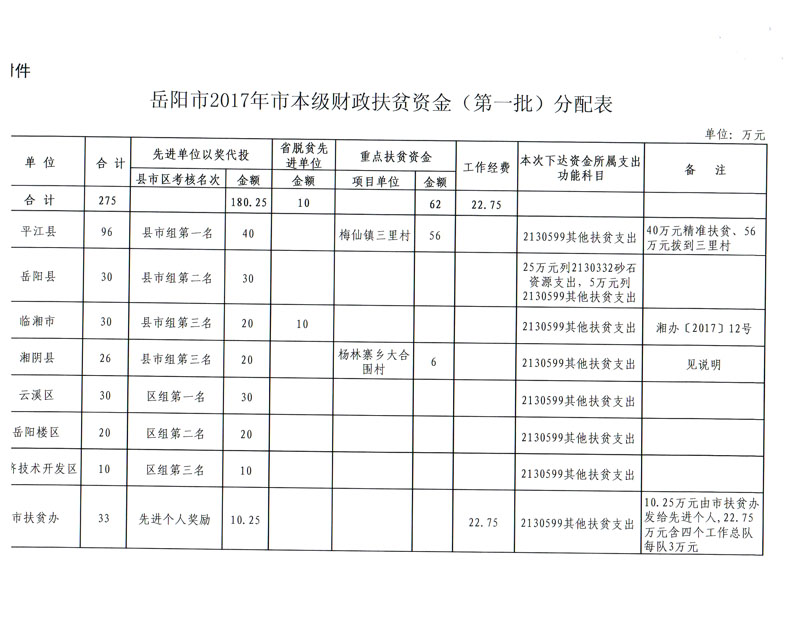 岳阳市财政局关于下达2017年市本级财政扶贫资金(第一批)的通知1