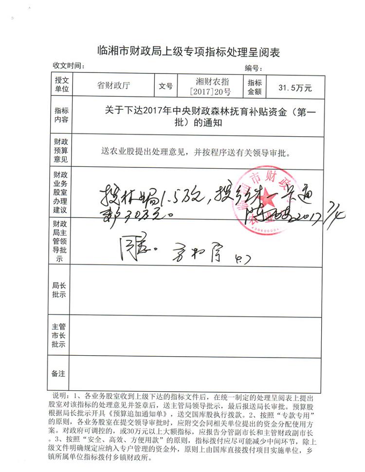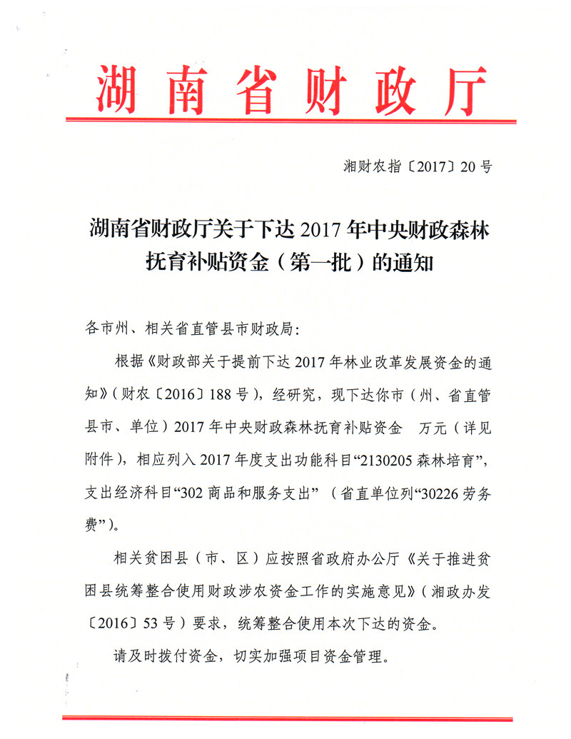 湖南省财政厅关于下达2017年中央财政森林抚育补贴资金(第一批)的通知