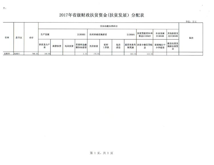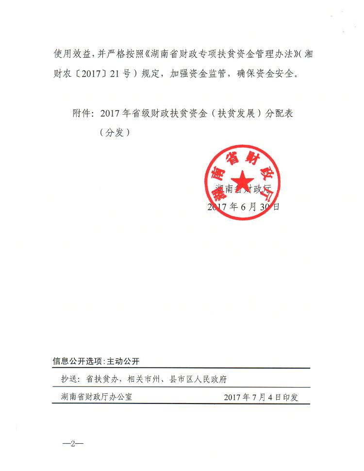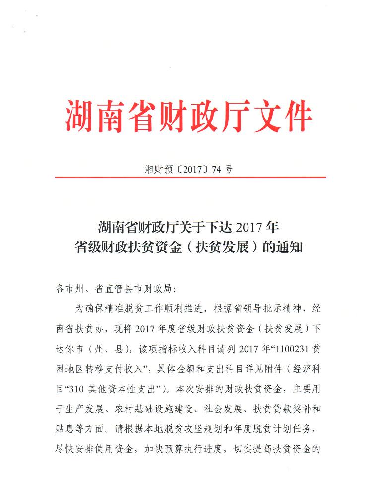 湖南省财政厅关于下达2017年省级财政扶贫资金(扶贫发展)的通知
