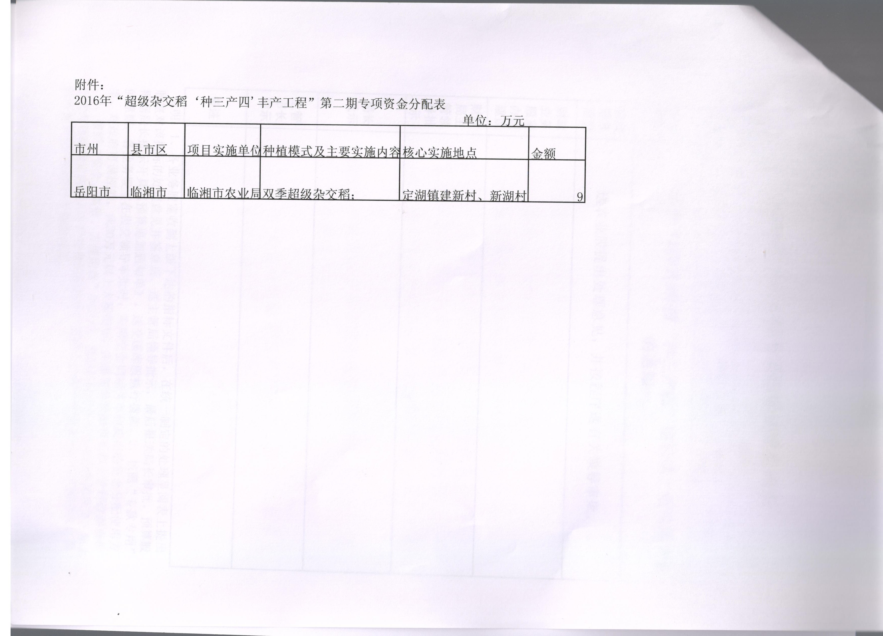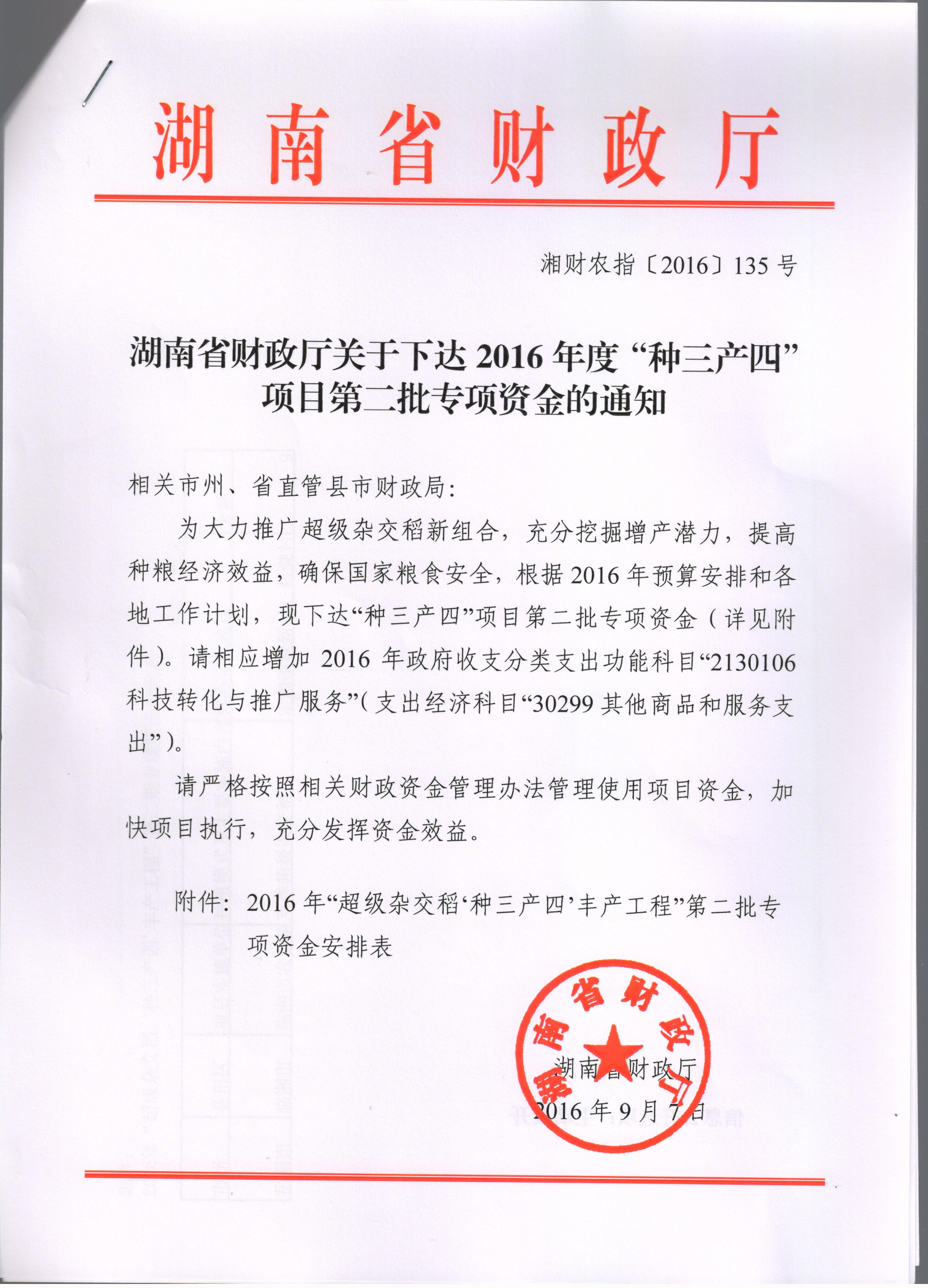 湖南省财政厅关于下达2016年度“种三产四”项目第二批专项资金的通知