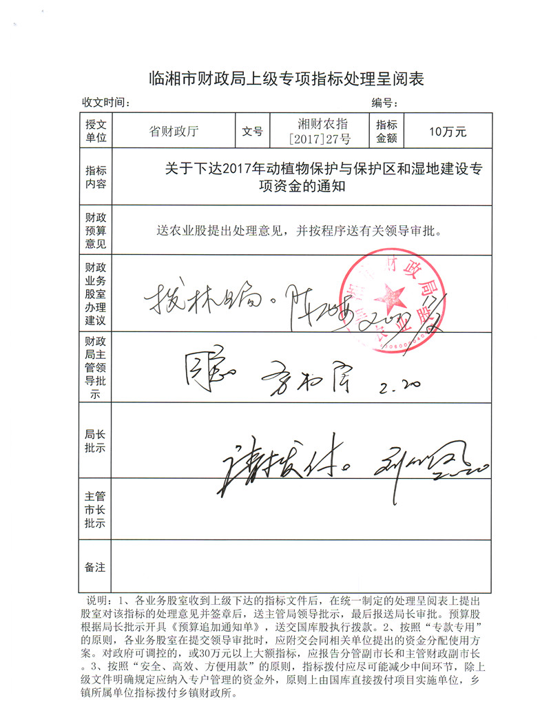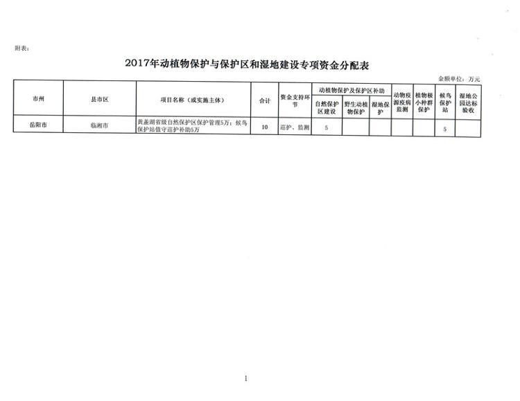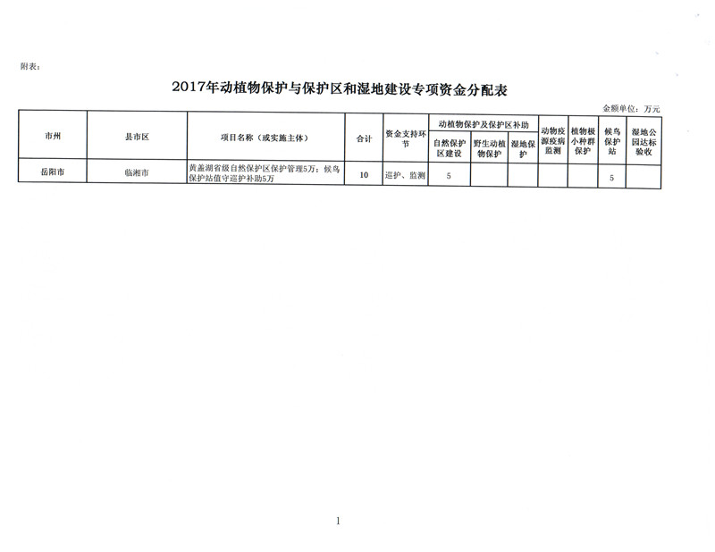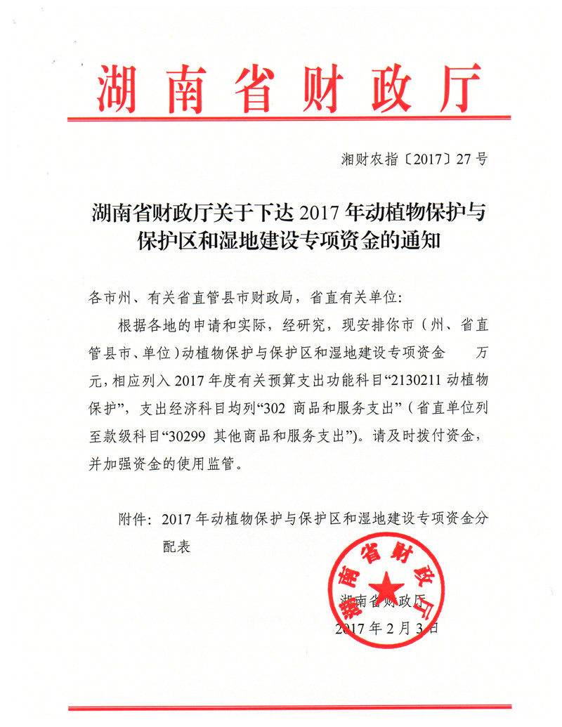 湖南省财政厅关于下达2017年动植物保护与保护区和湿地建设专项资金的通知