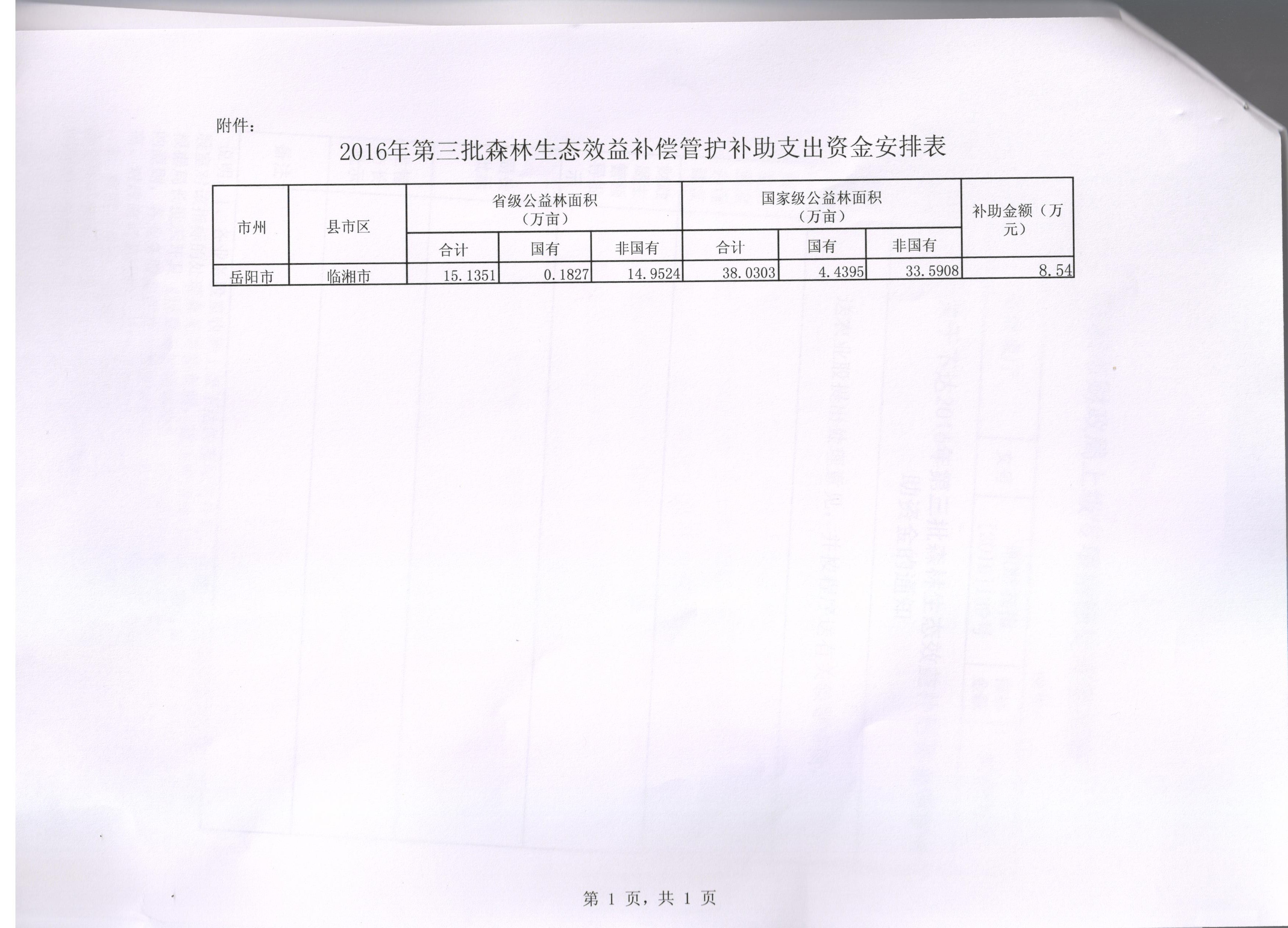 湖南省财政厅关于下达 2016 年第三批森林生态效益补偿基金管护补助资金的通知
