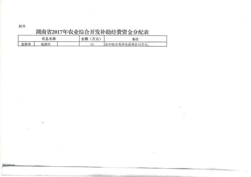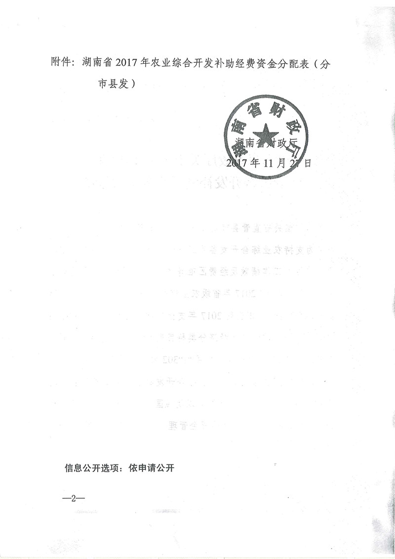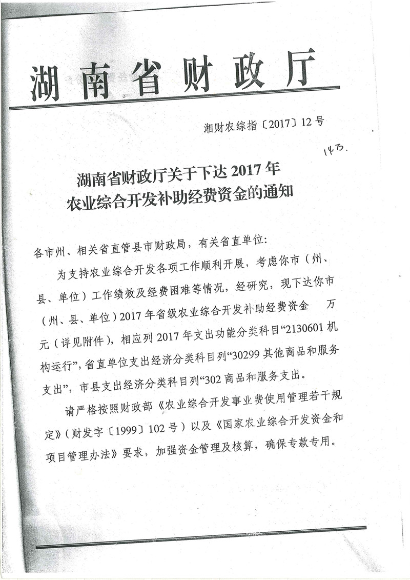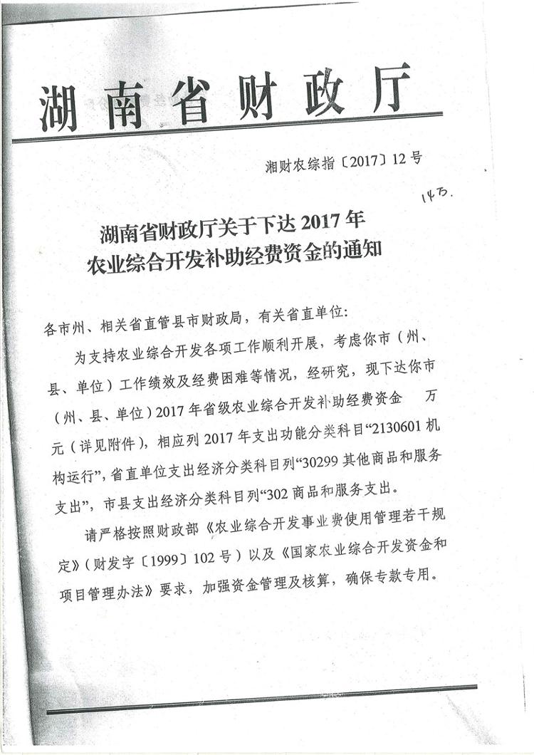 湖南省财政厅关于下达2017年农业综合开发补助经费资金的通知