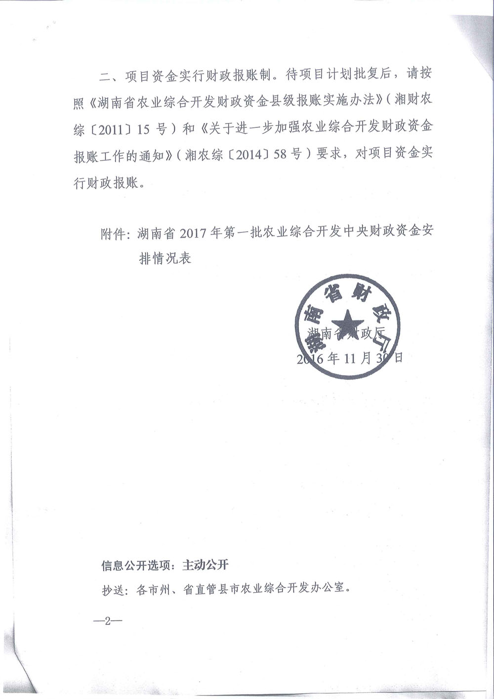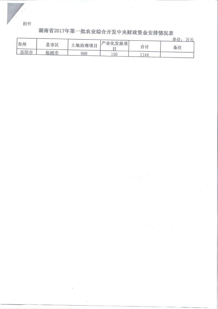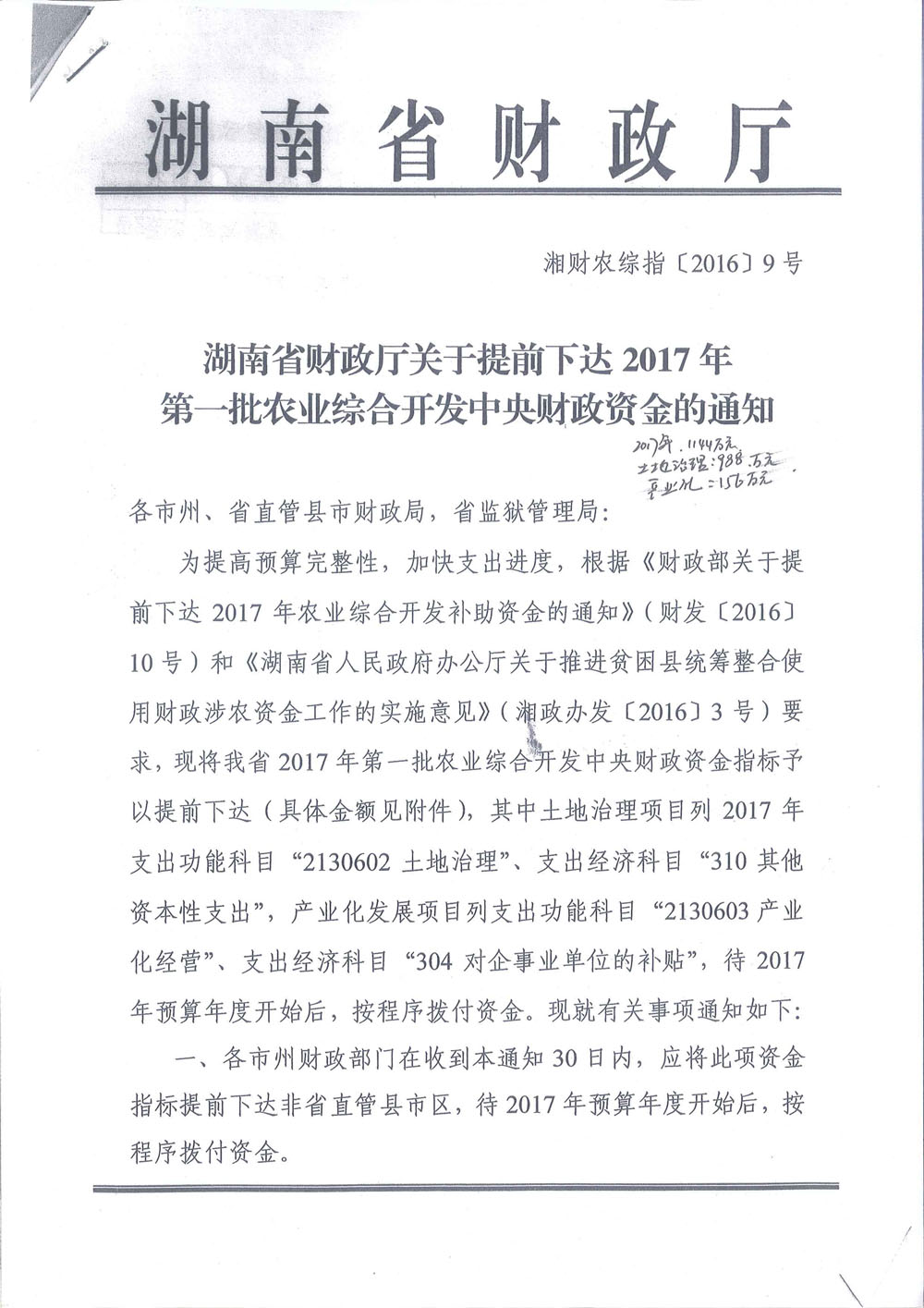 湖南省财政厅关于提前下达2017年第一批农业综合开发中央财政资金的通知