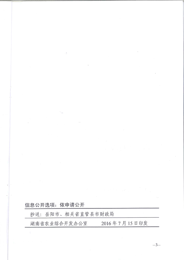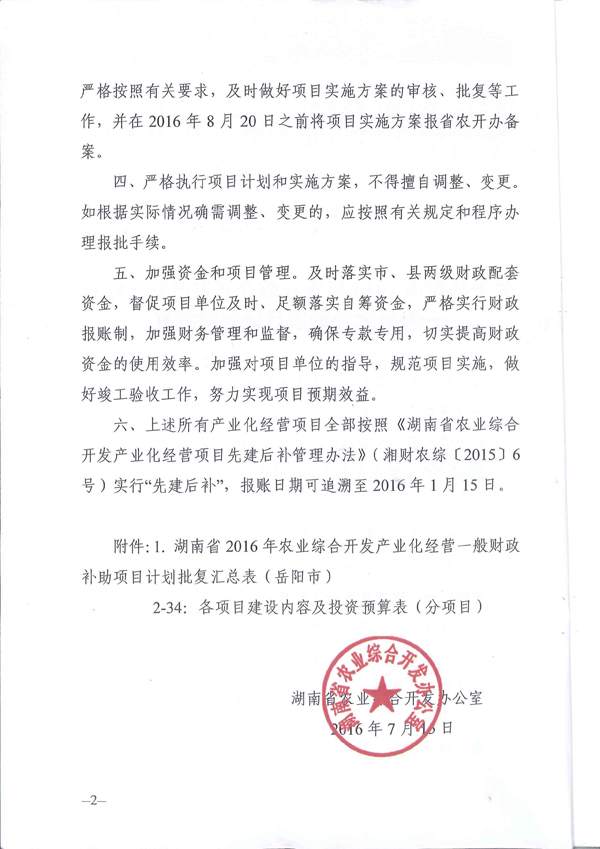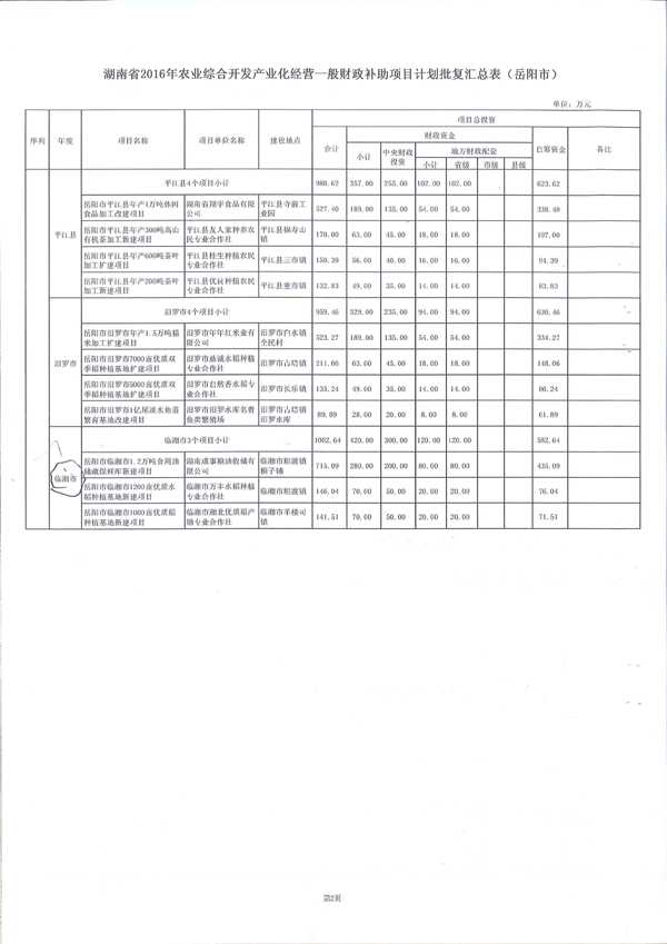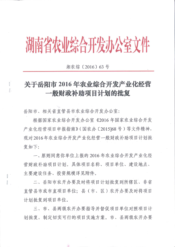岳阳市2016年农业综合开发产业化经营一般财政补助项目计划的批复