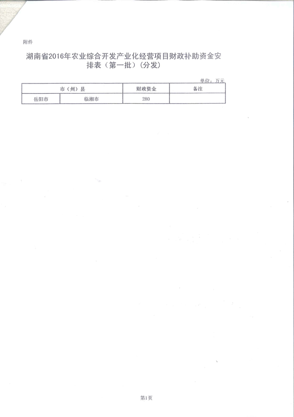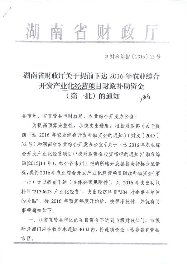 省厅提前下达2016年农业综合开发产业化经营项目财政补助资金通知