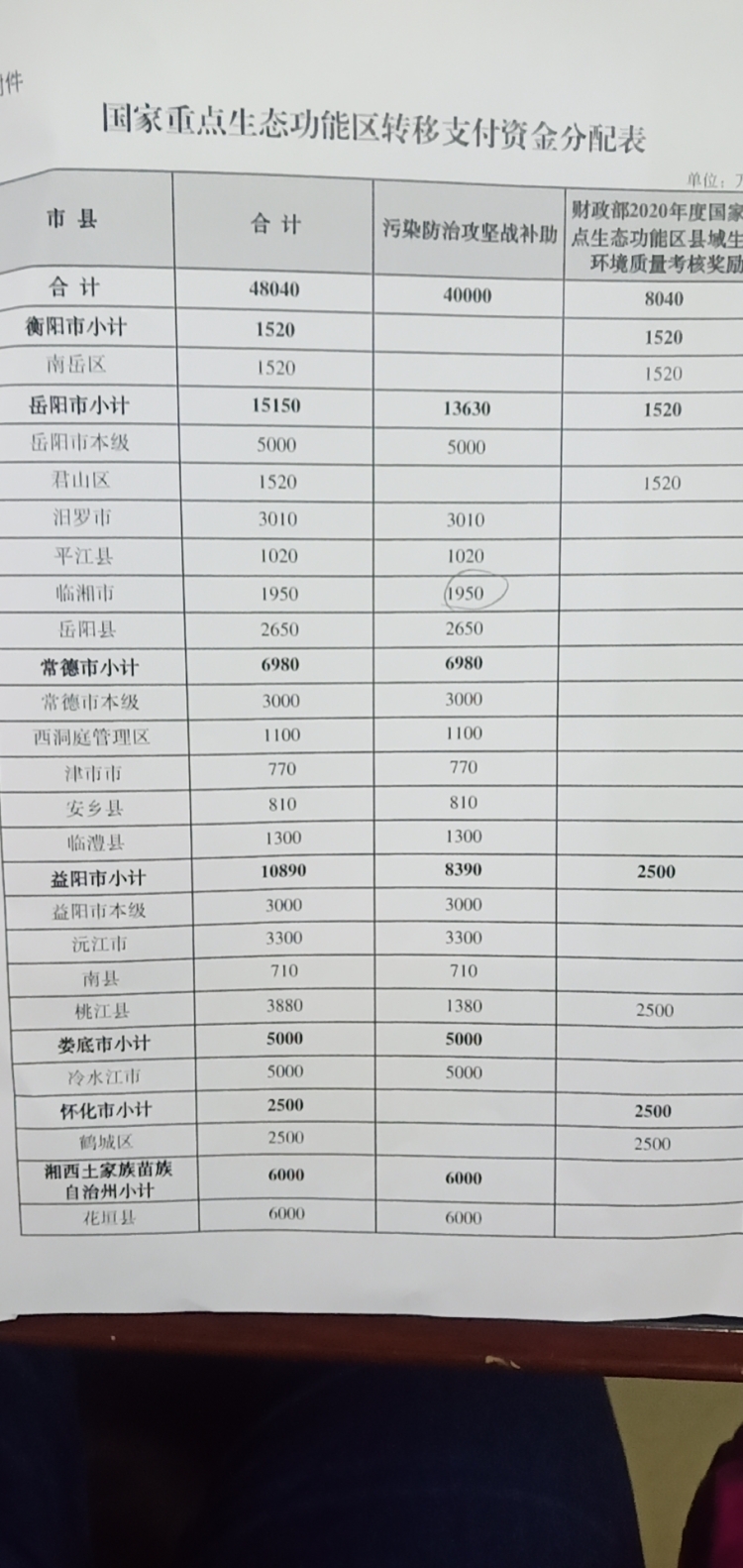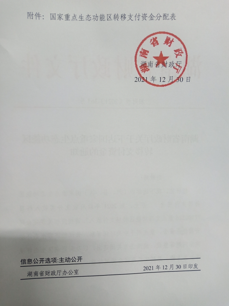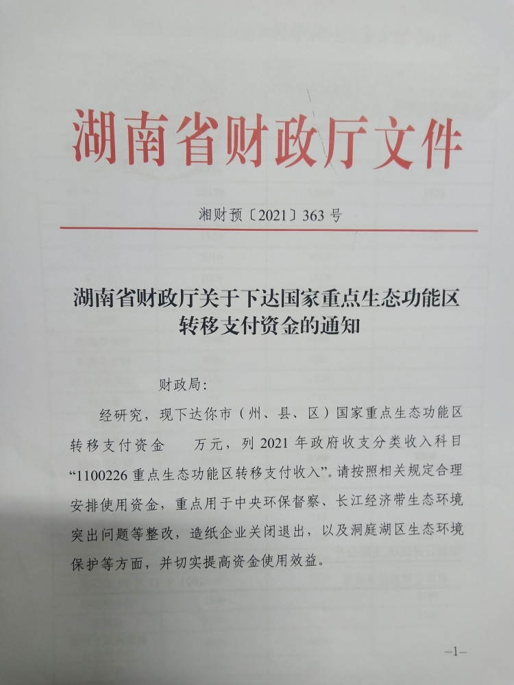 关于下达国家重点生态功能区转移支付资金的通知