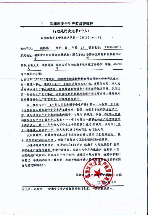 行政处罚姚陆林决定书