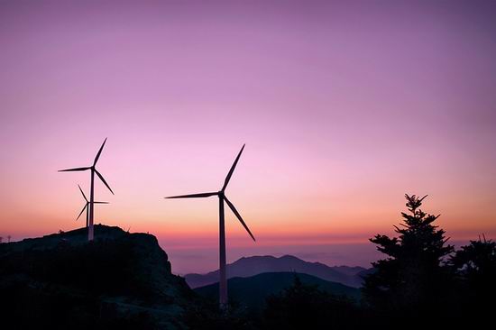 驻足107国道,远眺五尖山,巨大的风力发电机依序排开,阳光下叶轮徐徐旋转,绿色电力正源源不断输往国家电网。