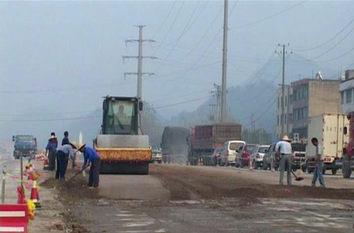 目前路面施工主要是在进行水稳铺设,据了解,原来老路设计是混泥土结构,由于考虑到沿线新路与老路的结构问题,需要把老路的混泥土全部拆除,再新铺发两层水稳,与此同时,桥梁的建设也在紧张施工中,预计在一个月时间内可以完工。